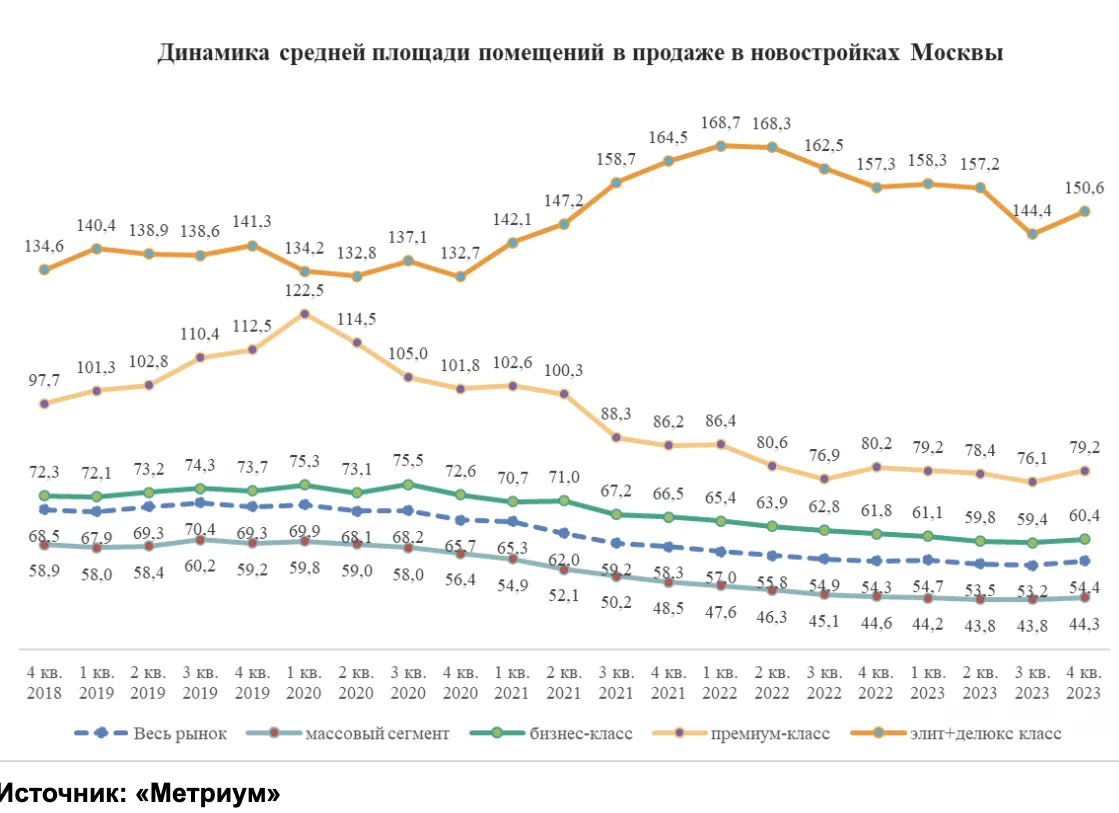 Больше всего в площади потеряли помещения в новостройках эконом- и комфорт-класса. За пять лет они стали меньше на 25%, потеряв 14,6 кв. м в среднем (44,3 кв. м сейчас против 58,9 кв. м в конце 2018). Далее следуют квартиры в новостройках премиум-класса, которые сократились в площади за пять лет на 19%. В 2023 году их средняя площадь составила 79,2 кв. м, тогда как в конце 2018 года она составляла 97,7 кв. м (минус 18,5 кв. м). Жилье в новостройках бизнес-класса потеряло в размерах в среднем 16%. К концу 2023 года средняя площадь помещения составила 60,4 кв. м против 72,3 кв. м в конце 2018 года (минус 11,9 кв. м). Помещения в элитных и делюкс-комплексах стали на 12% больше за пять лет (150,6 кв. м против 134,6 кв. м).