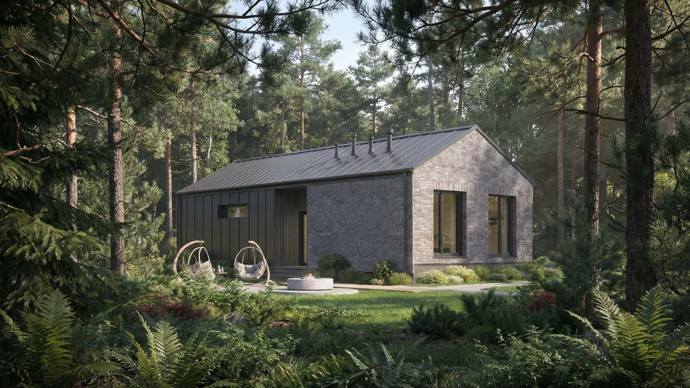 Архитектура проекта выполнена в скандинавском минимализме с лаконичными формами, сдержанной цветовой палитрой и элементами асимметрии. Новый формат коттеджей органично интегрирован в существующую застройку и поддерживает единый визуальный облик поселка.
