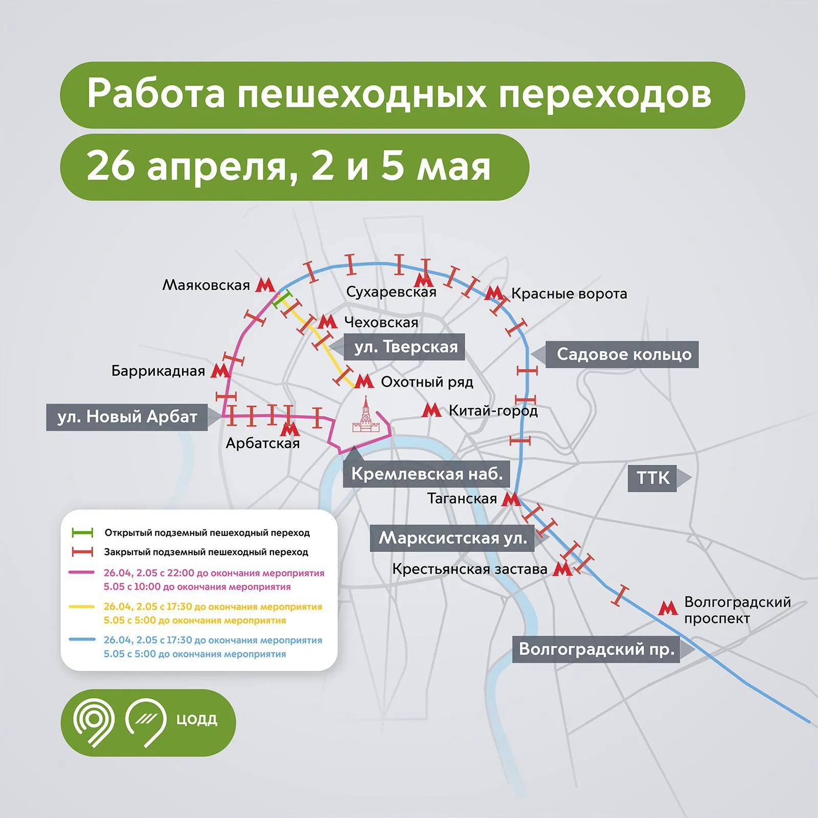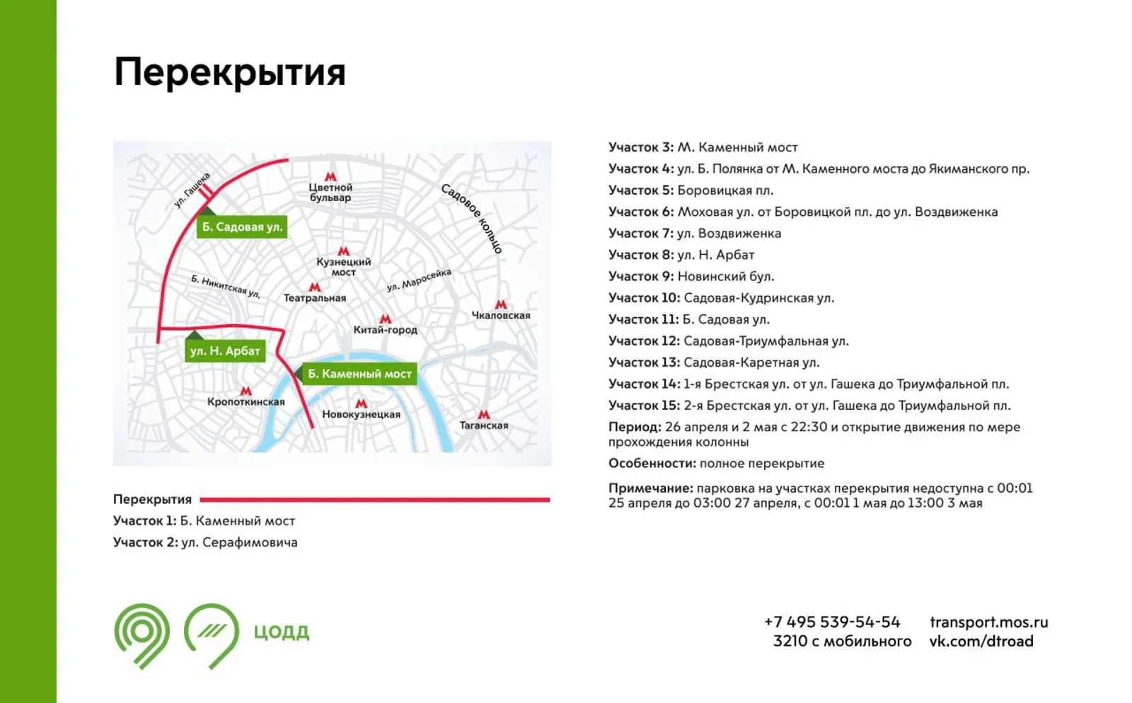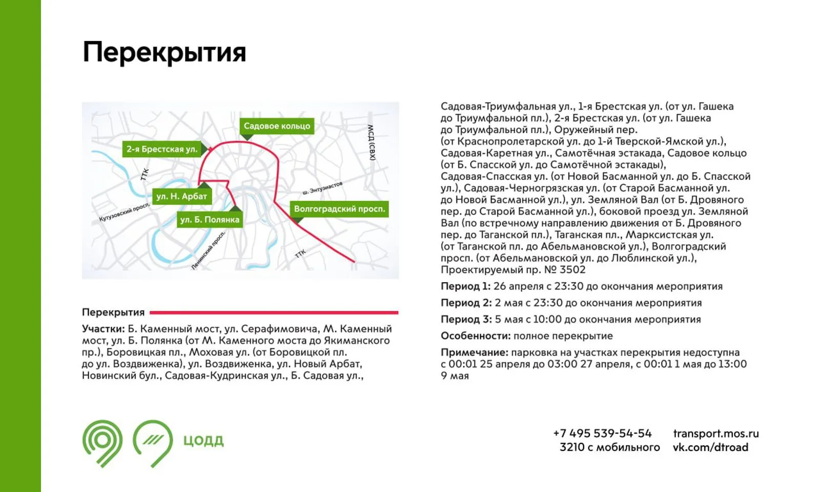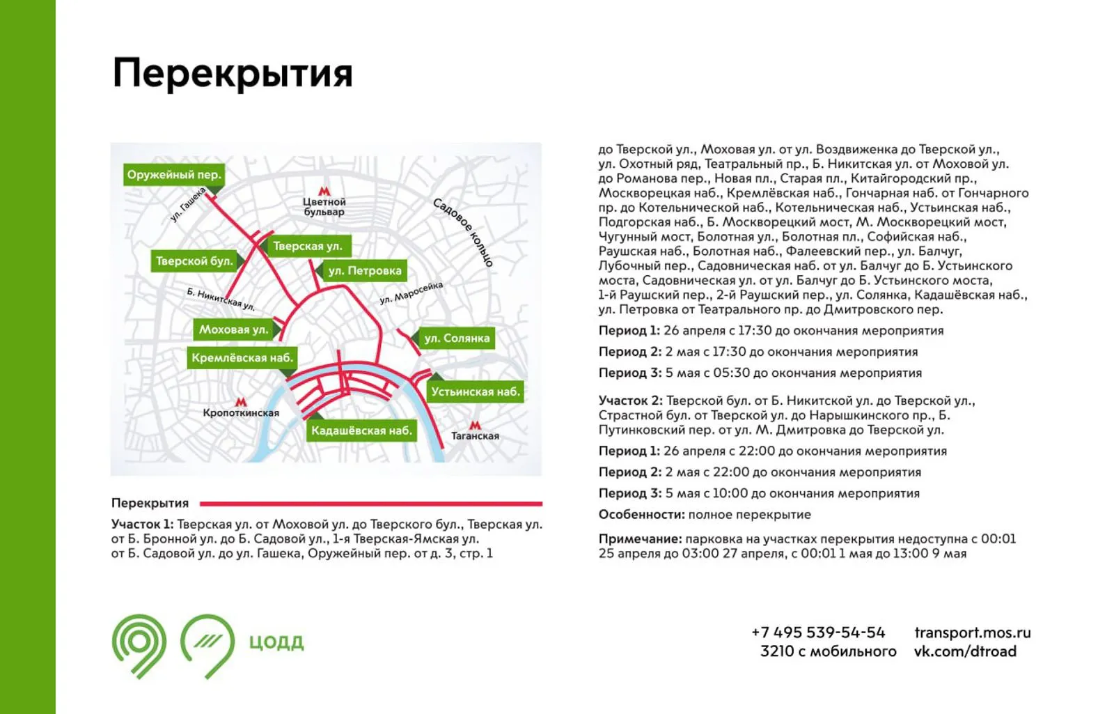 Движение будет закрыто: с 16:30 до 19:00 на участках Волгоградского проспекта, Садового кольца, Таганской площади; с 17:30 до окончания мероприятия на ряде центральных набережных и улиц.