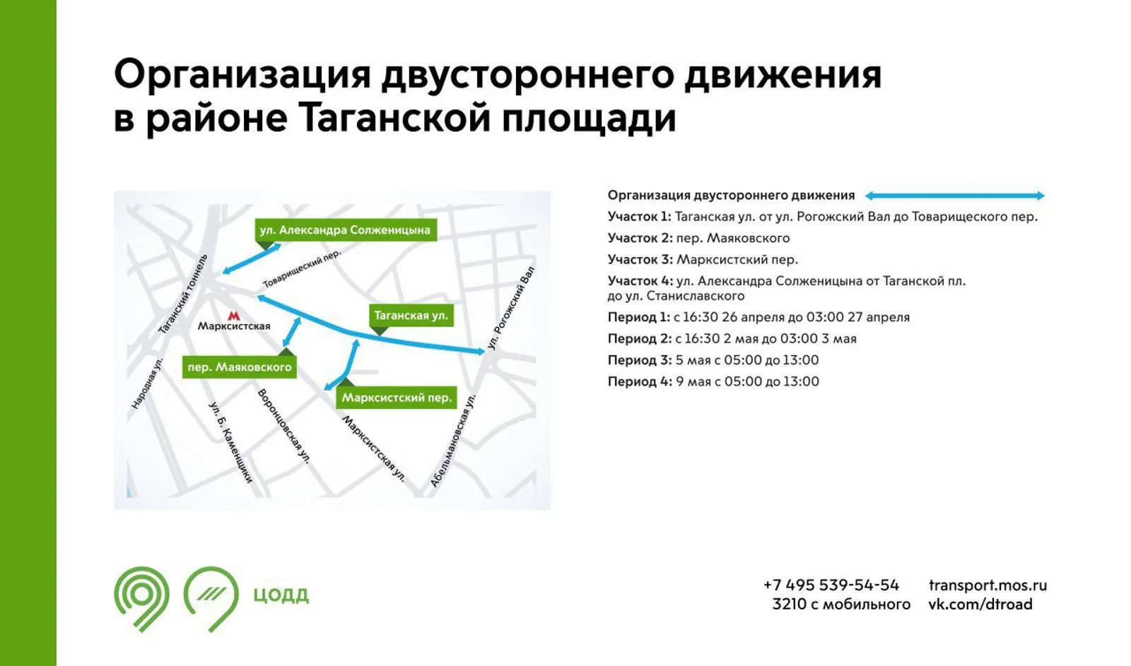 В районе Таганской площади с 16:30 мск 2 мая до 03:00 мск 3 мая будет организовано двустороннее движение. На участках будет запрещена парковка с 1 до 9 мая.