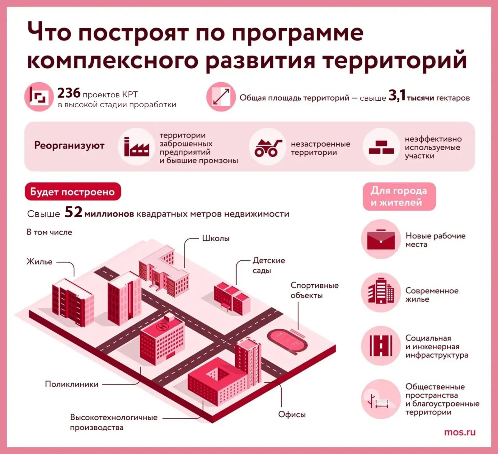 Из 236 проектов КРТ, которые сейчас прорабатываются и реализуются в Москве, 221 находится за пределами Третьего транспортного кольца. Это более 90% от общего числа. «На участках общей площадью свыше трех тысяч гектаров предусмотрено строительство почти 50,2 миллиона квадратных метров различной недвижимости. Благодаря реализации проектов за пределами ТТК появится 732 тысячи рабочих мест. Инвестиции в проекты превысят 16,6 триллиона рублей, а ежегодный бюджетный эффект после их реализации — 1,5 триллиона рублей», — рассказал Владимир Ефимов.