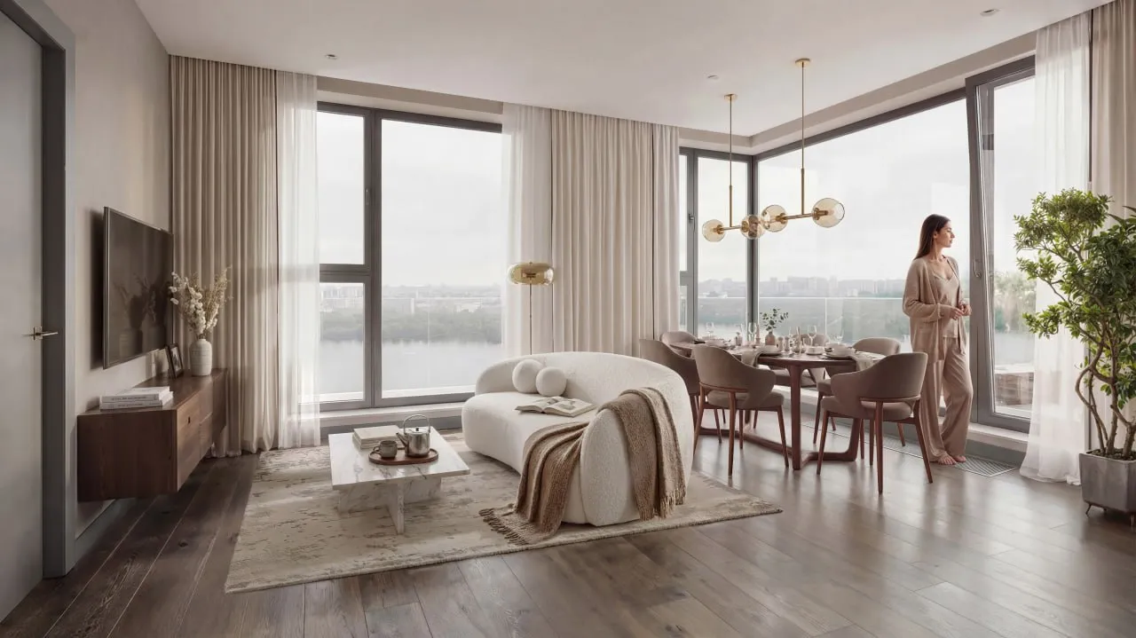 Отвечая на данный запрос, Asterus предлагает покупателям квартиры с уже выполненной чистовой отделкой. Пространства реализованы в нейтральной стилистике с использованием качественных и износостойких материалов. В жилых комнатах предусмотрены напольные покрытия с текстурой дерева, в зонах с повышенной нагрузкой – керамогранит. Стены оформлены в сдержанной цветовой гамме, что позволяет адаптировать интерьер под индивидуальные предпочтения.