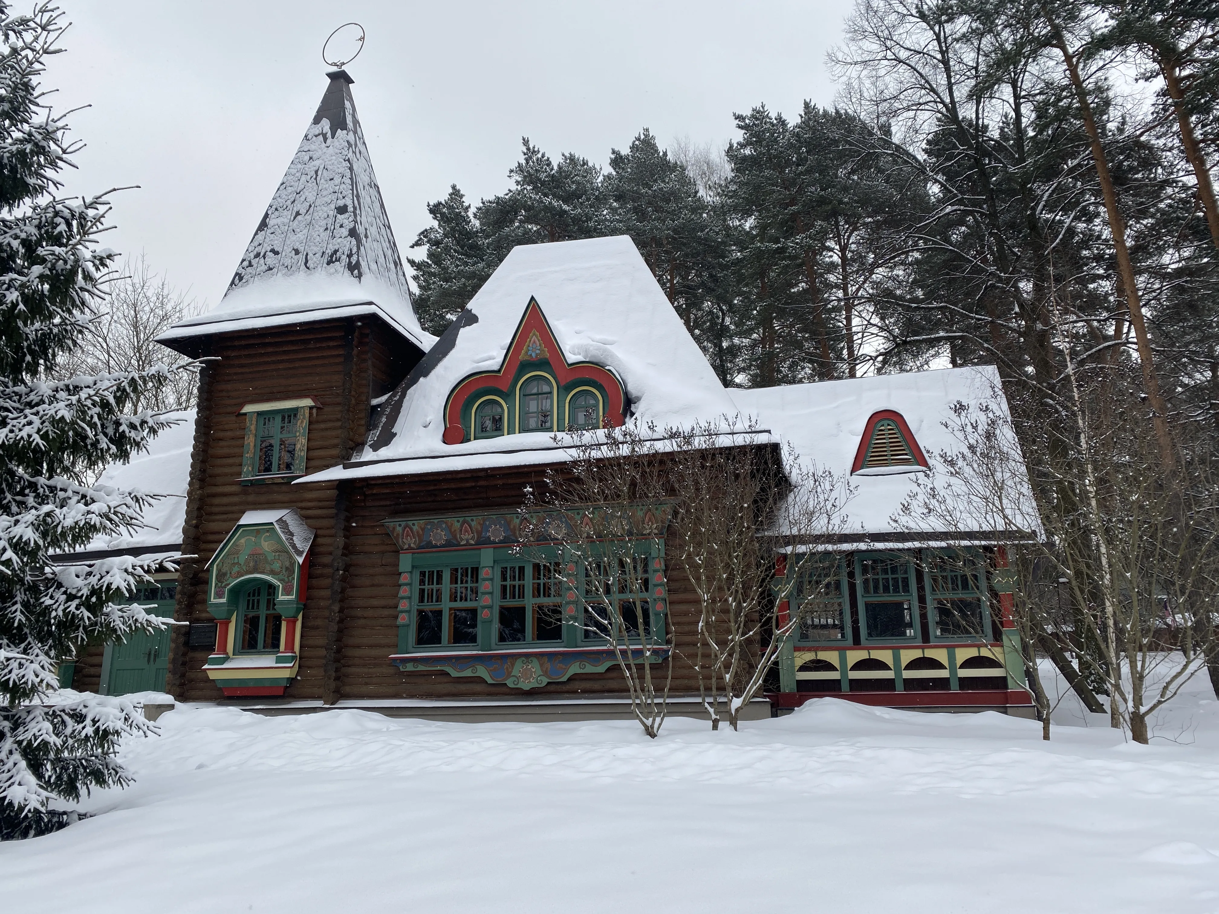 Здание построили на возвышенности — среди зелени над рекой. Деревянная одноэтажная дача с мансардой располагается в глубине участка. Ее украшают выступы ризалитов, открытые крыльца-террасы и щипцы — так называется верхняя часть стены здания, ограниченная двумя скатами крыши и не отделенная от остальной плоскости стены карнизом (выступ, разделяющий этажи на фасаде здания). Фасады выделены деревянными брусьями. На мансардном этаже расположены тройные арочные окна, объединенные фигурным архивольтом и украшенные щипцом. Вход в здание отмечен двухъярусной башенкой (лестничный блок) с шатром, увенчанным шпилем с флюгером в виде птицы сирин в круге.