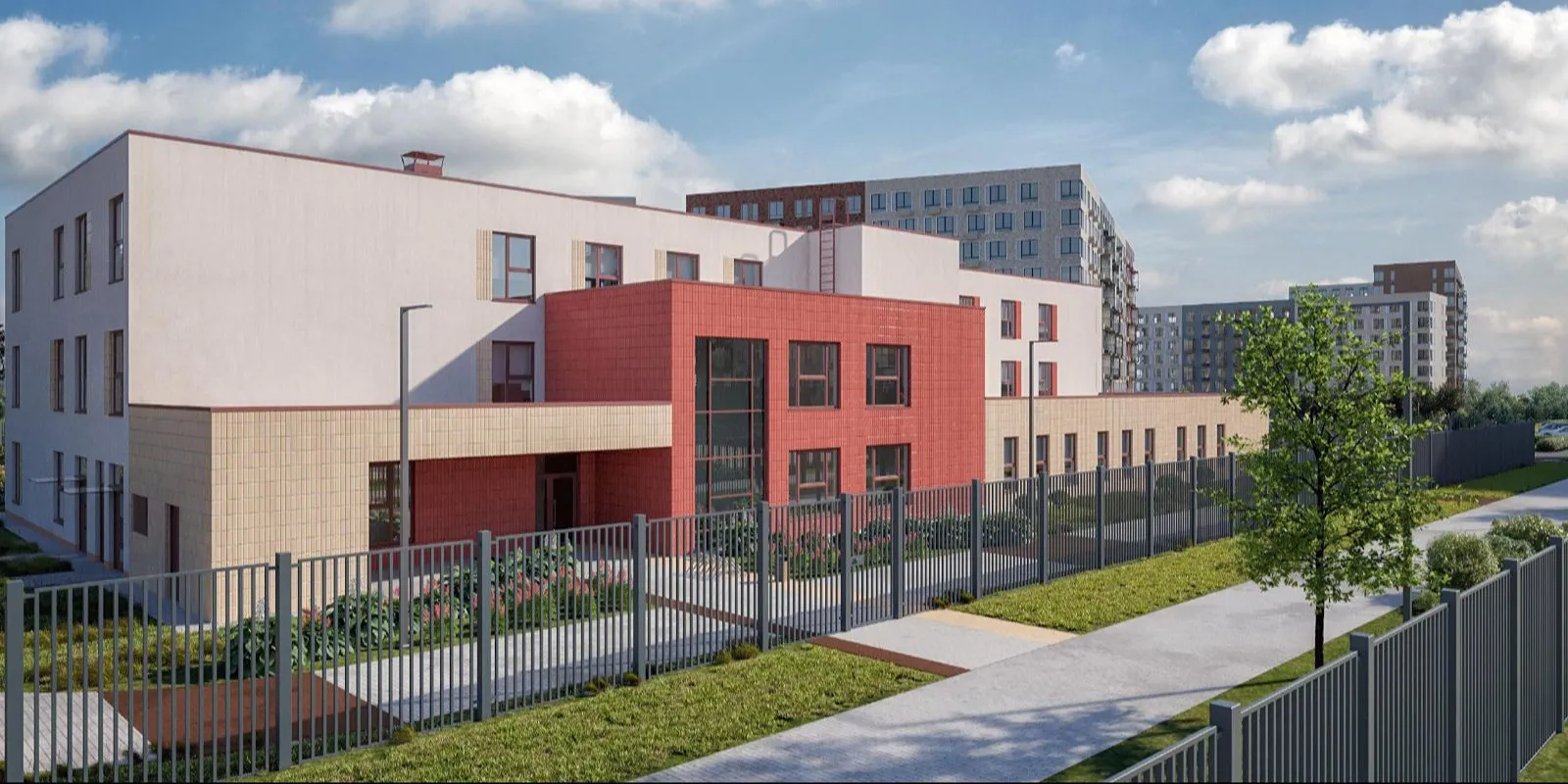 Во дворе высадят лиственные деревья, кустарники и цветники. Также на улице установят восемь детских площадок – по одной для каждой группы. В западной части участка запроектированы две спортивные площадки площадью 150 и 250 квадратных метров.