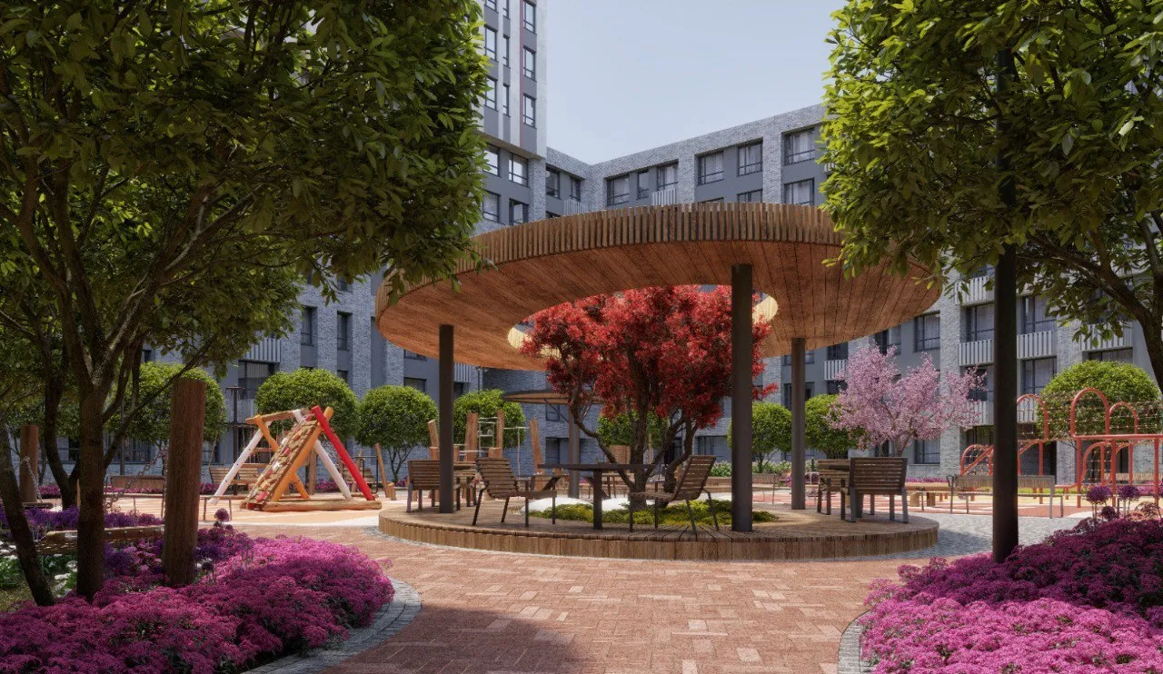 Большое внимание в оформлении экоплощадок во дворах уделено живым растениям. Они будут высажены по периметру, что сделает пространство максимально живописным. Ухоженный вид двору придадут взрослые деревья высотой 4-5 метров: яблони, клены и ивы, а также вечнозеленые можжевельники. Дополнят ландшафтную композицию декоративные клумбы из микса многолетних цветущих растений и злаков.