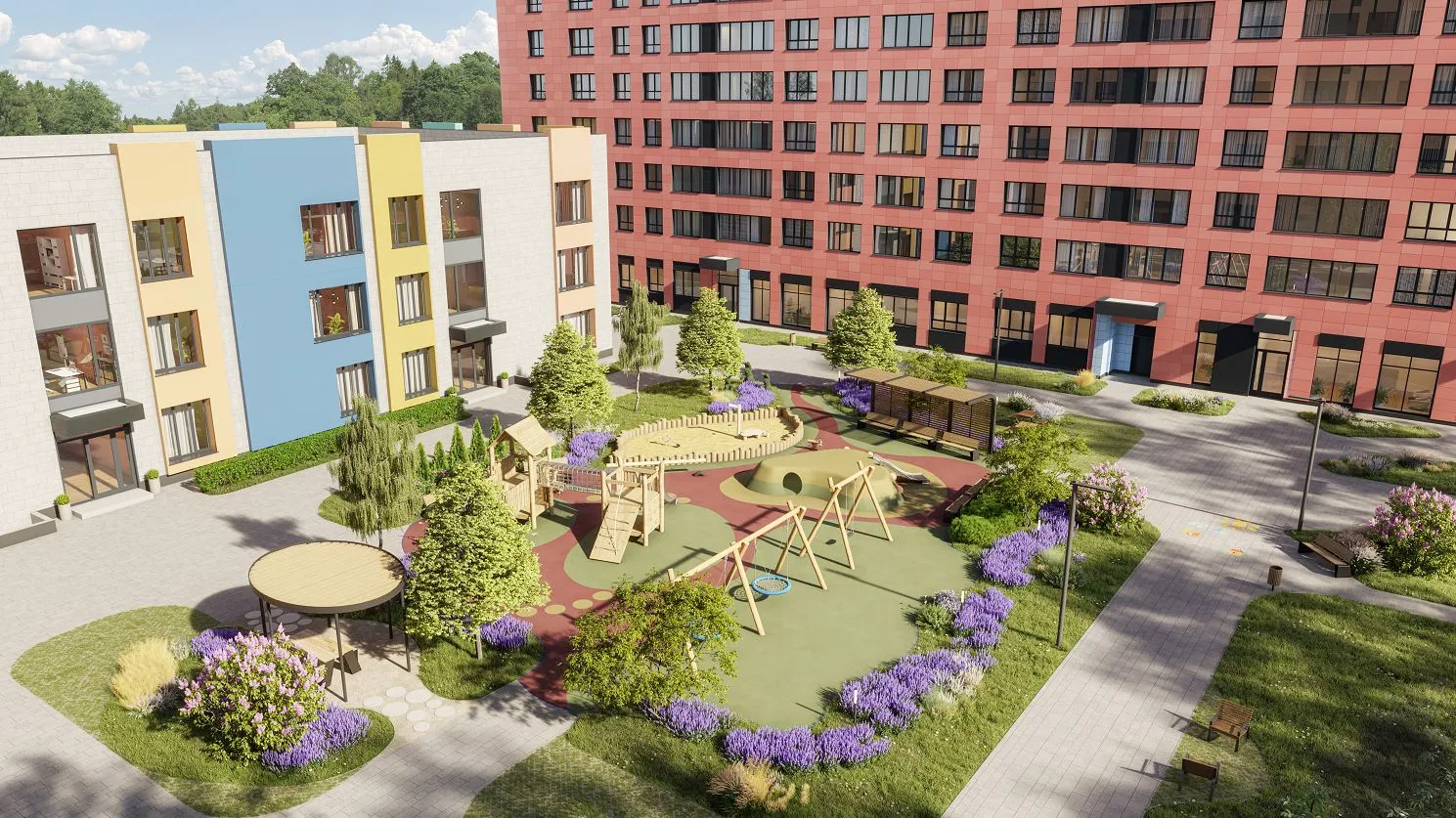 Во внутреннем дворе «без машин» планируется обустроить детскую площадку. Возле входа в детский сад предусмотрены огороженные игровые и спортивные площадки.
