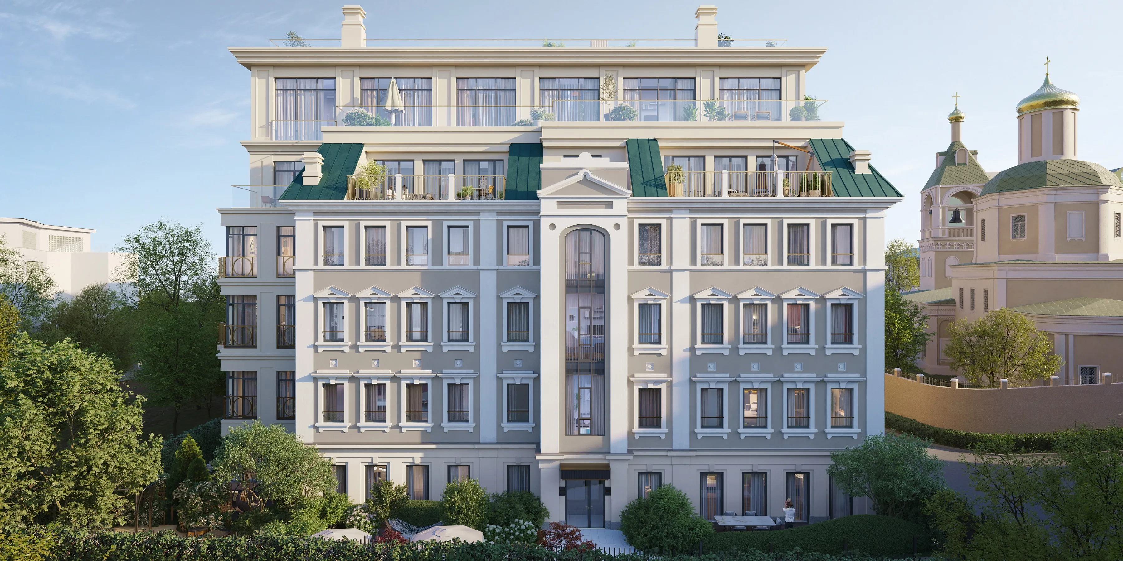 Благородные оттенки отобранных материалов в сочетании с кровлей из патинированной меди, изящные латунные ограждения классических и французских балконов превращают «Обыденский № 1» в настоящий «дом-шкатулку». Карнизы, наличники, пилястры с каннелюрами, рустовые колонны и ризалит с фронтоном создают живописный рельеф фасадов. Дом хочется рассматривать с разных ракурсов и в мельчайших деталях.