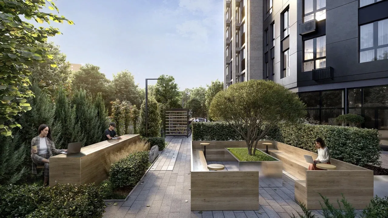 Пространство прилегающей территории имеет два уровня приватности: первую линию и внутренний двор, закрытый для посторонних. Первая линия будет ориентирована на улицу Зорге. Это пространство с беспрепятственным доступом к коммерческим помещениям и лобби. Часть первой линии будет доступна для автомобилей, другая является пешеходной, без возможности проезда и парковки автомобилей. На пешеходном пространстве первой линии установят скамейки и озеленением в кашпо.