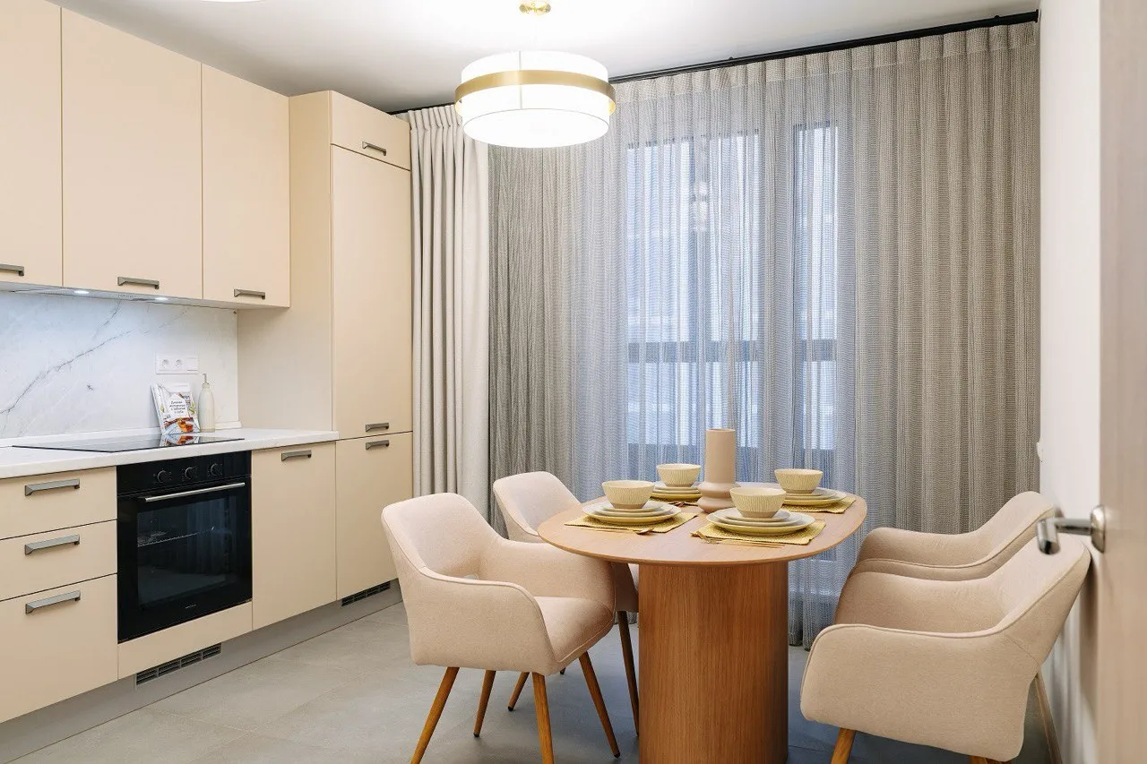 Вся мебель подобрана группой экспертов ГК ФСК индивидуально под планировочные решения готовой отделки жилого комплекса. Таким образом, гарнитуры гармонично вписаны в пространство комнат, учитывают параметры помещения и интерьер.