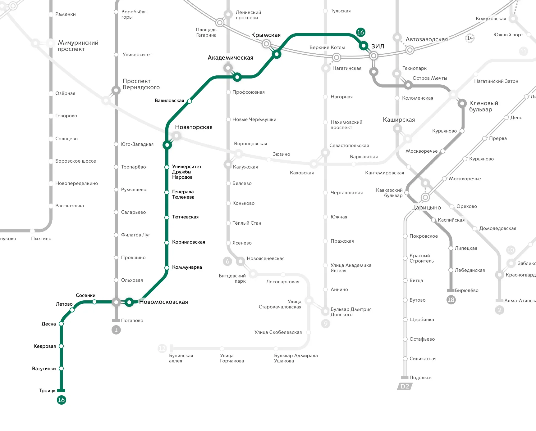 Сейчас идет строительство первой очереди Троицкой линии от станции «ЗИЛ» до станции «Новомосковская» общей протяженностью 26,6 километра и включающей 11 станций. Участок «Новаторская» – «ЗИЛ» (он также включает станции «Крымская», «Академическая» и «Вавиловская») планируется завершить в 2025 году. По второй очереди Троицкой линии («Новомосковская» – «Троицк») пока еще ведется разработка проектной документации.Общая протяженность Троицкой линии составит 43,4 километра, а число станций увеличится до 17. Благодаря этому она станет одним из самых протяженных радиусов московского метро и самым большим за МКАД.