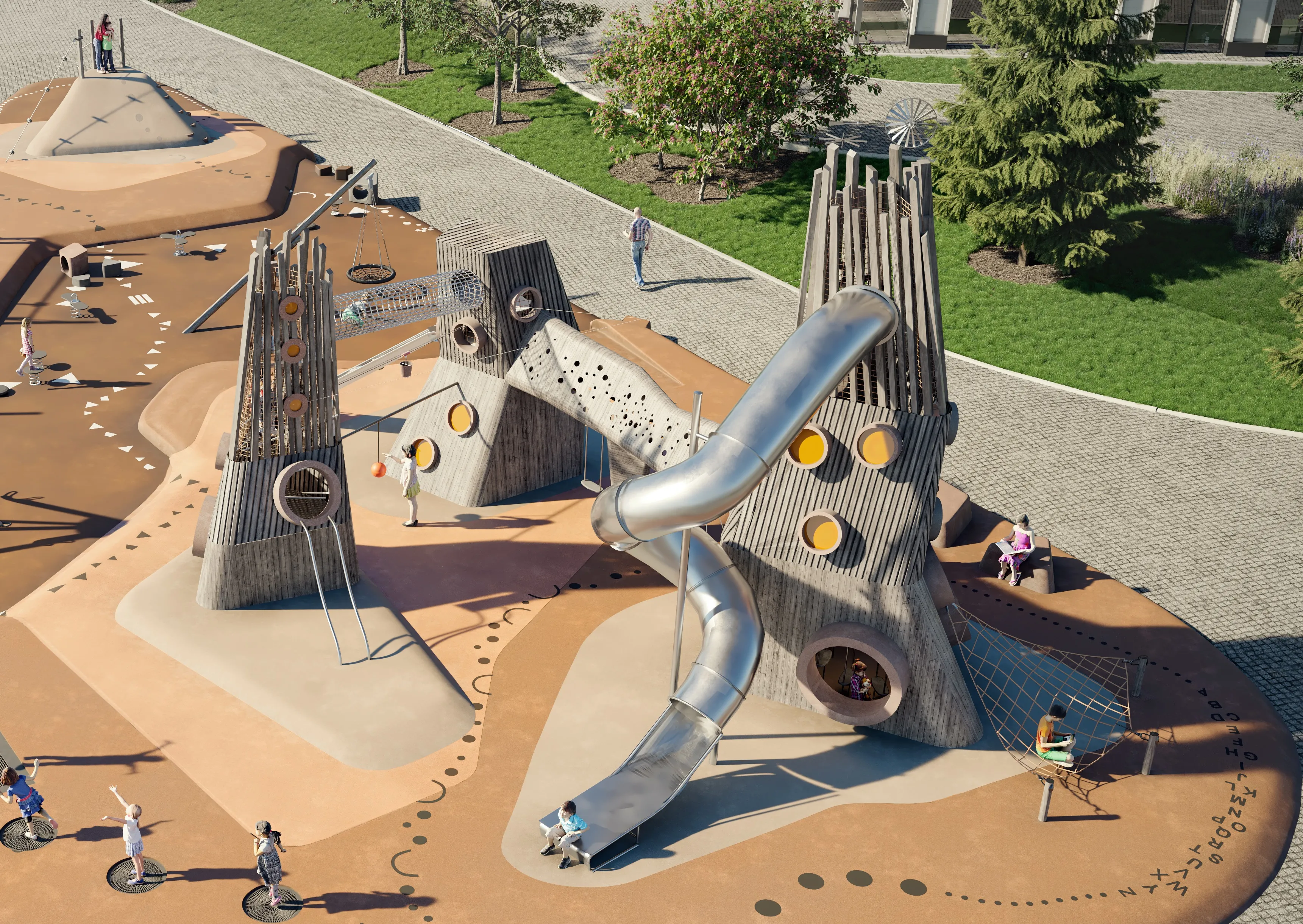 Башни «Энергии» наполнены лазательными структурами. Снаружи их дополняют горки, лестницы, подъёмы и полноценный скалодром. Также девелопер предусмотрел здесь беговой маршрут в покрытии, качели, карусели и другие игровые элементы, интересные детям разных возрастов.