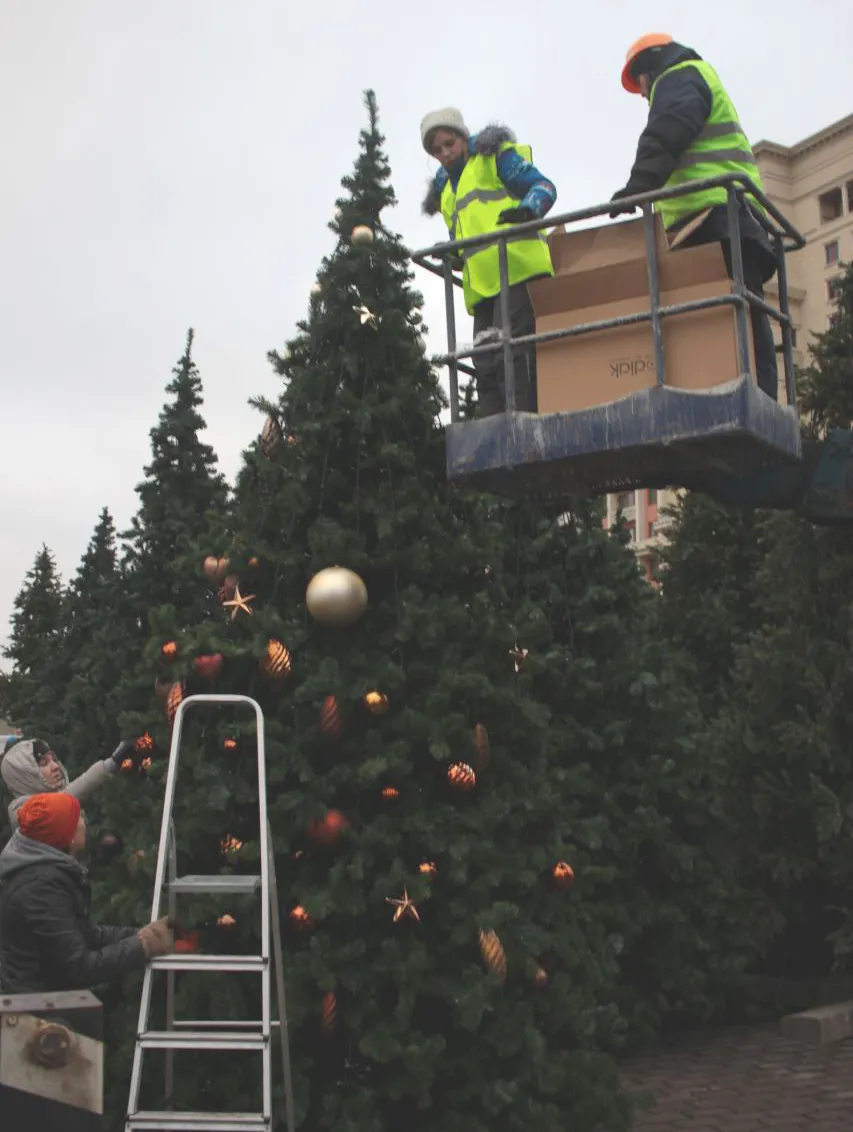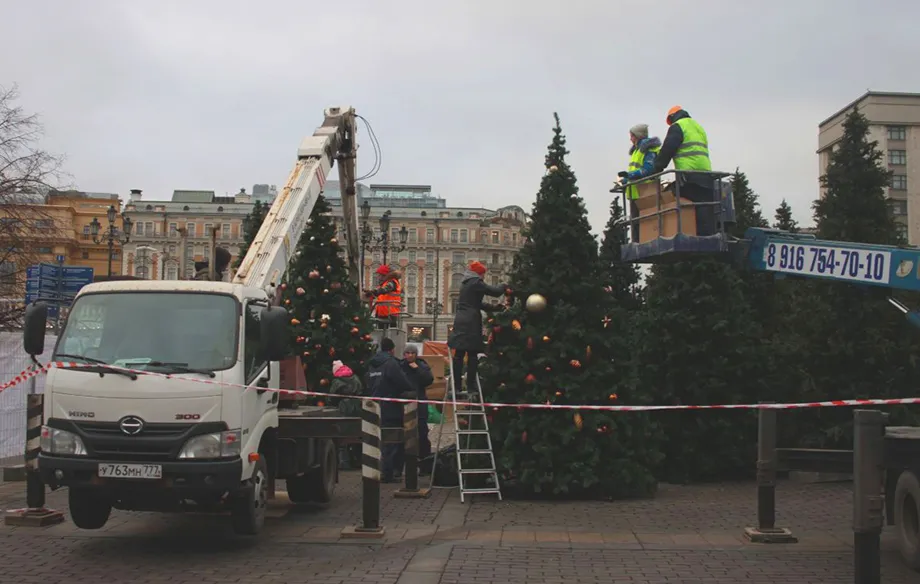 На Манежной площади наряжают новогодние елки, скоро их расставят по окрестностям. Самая большая стоит пока без игрушек