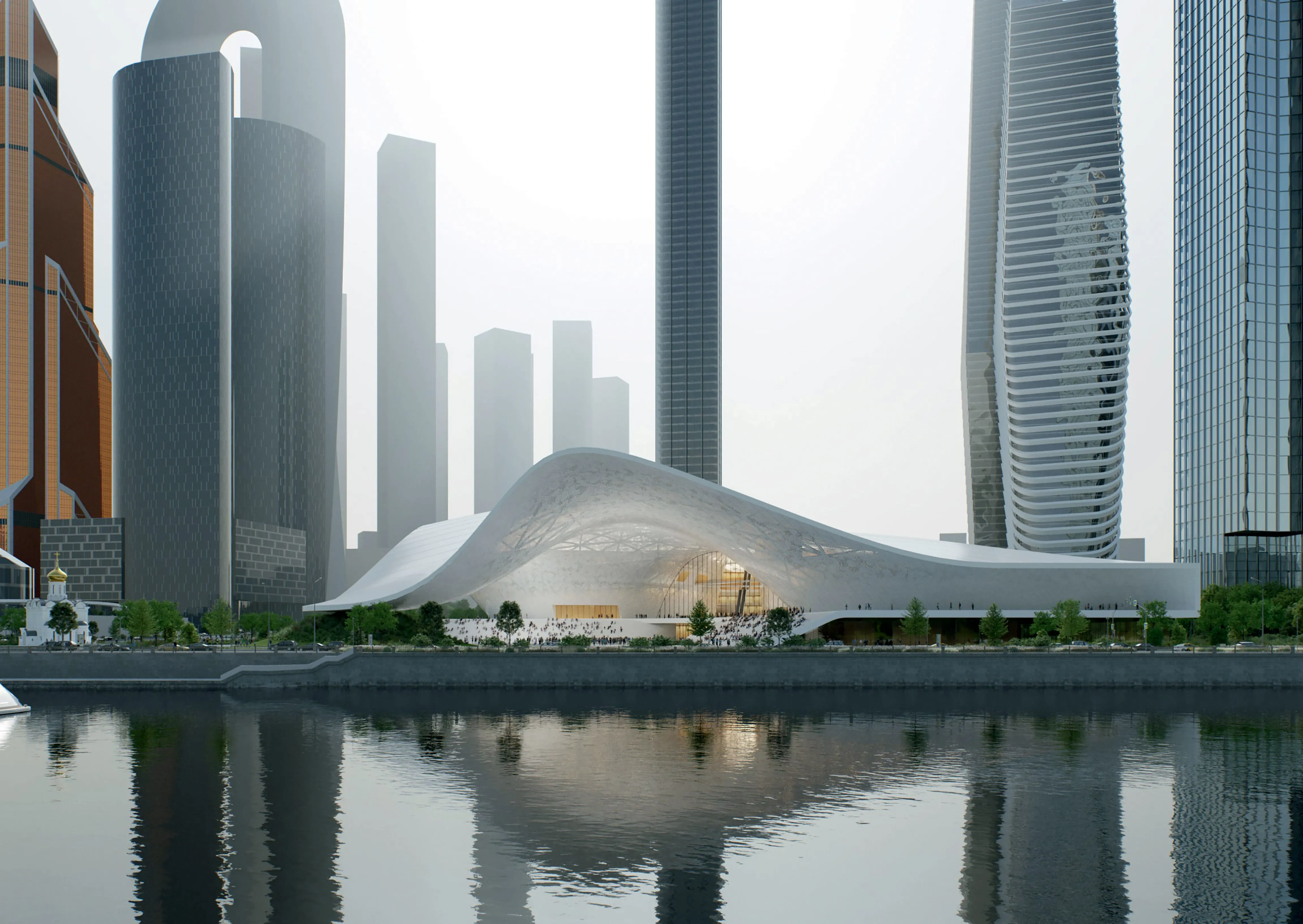 В Москве первым таким сооружением стал КЗ «Зарядье» в одноименном парке. Эскиз здания принадлежит главному архитектору Москвы Сергею Кузнецову, проект выполнило ТПО «Резерв». Масштабная скатная крыша, смонтированная из стеклянных конструкций, волно- образная и несимметричная по форме, напоминает тело гигантского ската. В проекте она получила название стеклянной коры. В этой же стилистике в парке «Зарядье» построена из фибробетона и «ледяная пещера».