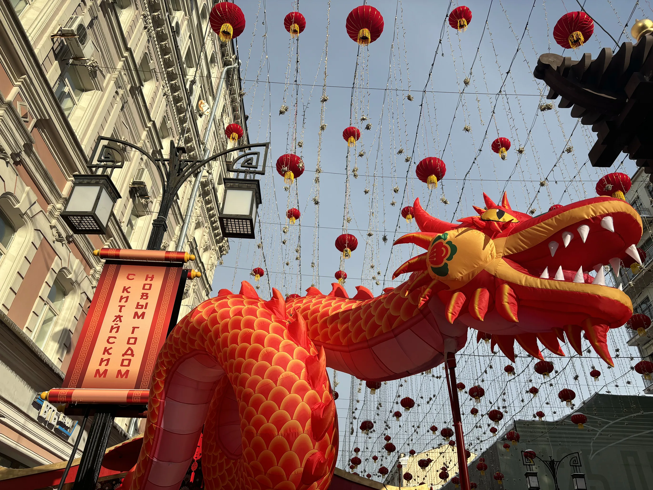 И все же главной достопримечательностью новогоднего фестиваля стал Камергерский переулок, украшенный огромным количеством китайских красных фонариков и арками в виде извивающегося дракона и сакуры – со стороны Тверской улицы и Большой Дмитровки.