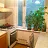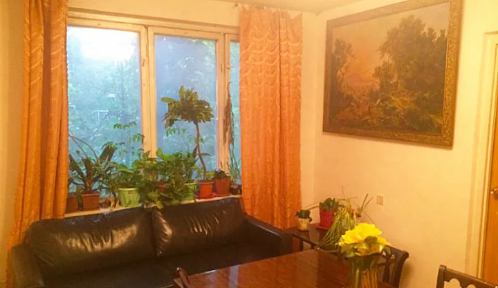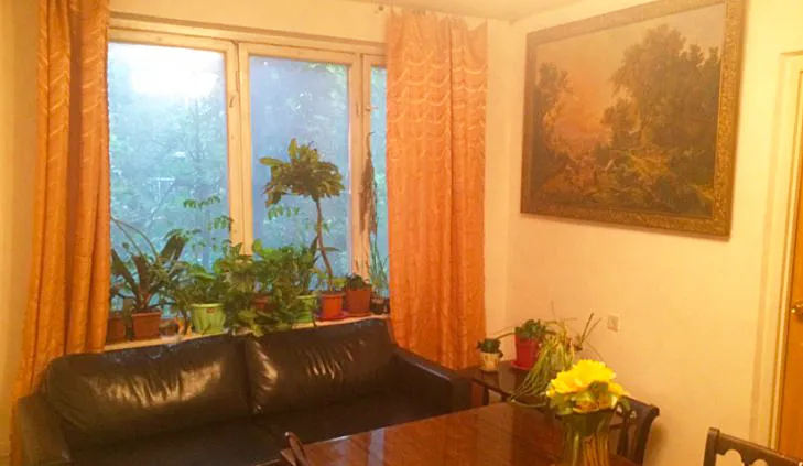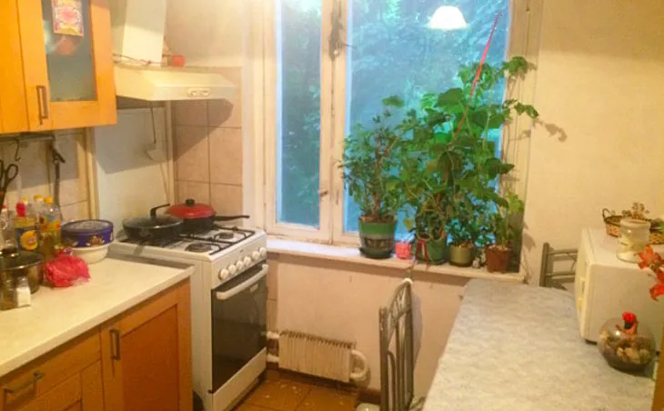 Комната за 10 тысяч вполне приличная. На шкафу репродукция Ван Гога, на линолеуме стоит стол с цветами, на подоконнике в кухне — растения. Вызывает подозрение только латексный черный диван.