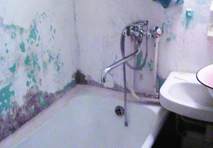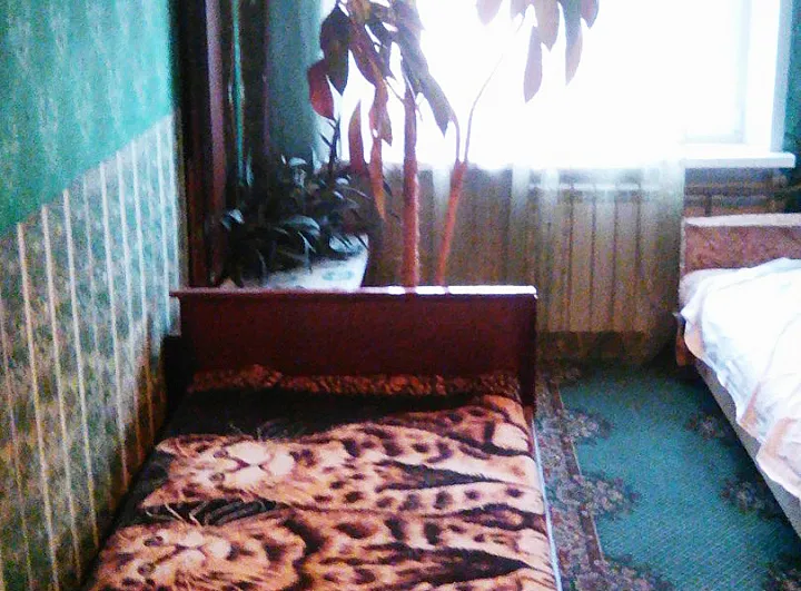 Балкон не застеклен. Недавно был капремонт, и теперь стало меньше слышно проходящие электрички. Сама комната 10 кв. м. В ней по бокам две старые кровати. Одна с твердым матрасом, другая с пружинным. В ванной на стене остатки зеленой краски образуют узор.