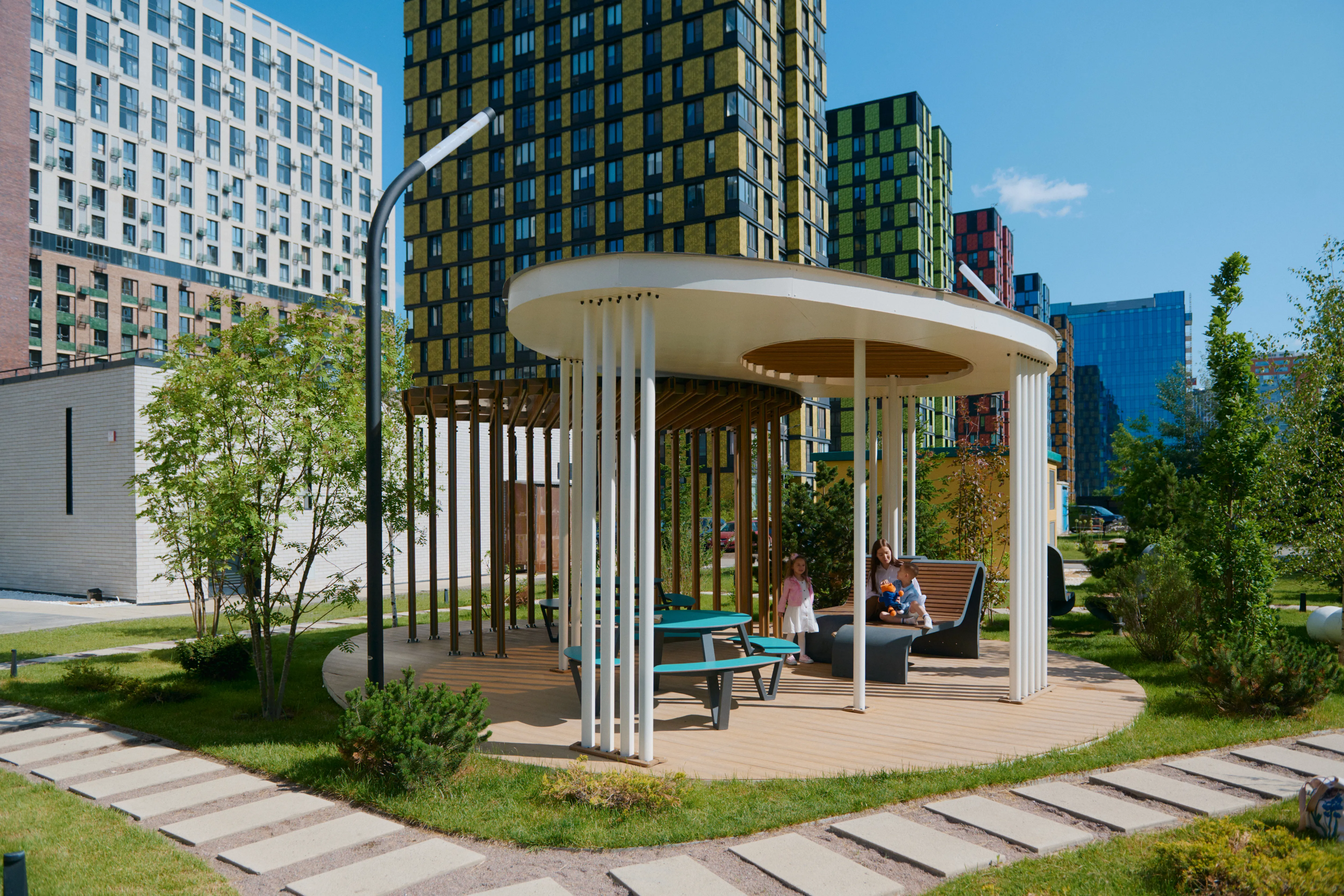 Еще один интересный тренд – создание комьюнити центров во дворе, то есть зон со столами для пикников и встреч, праздников и мероприятий. «Существует также тренд на сезонность. Зима в Москве длится 9 месяцев, поэтому нужно думать не только об озеленении, но и о навесах с подогревом, зонах для зимних игр и забав».