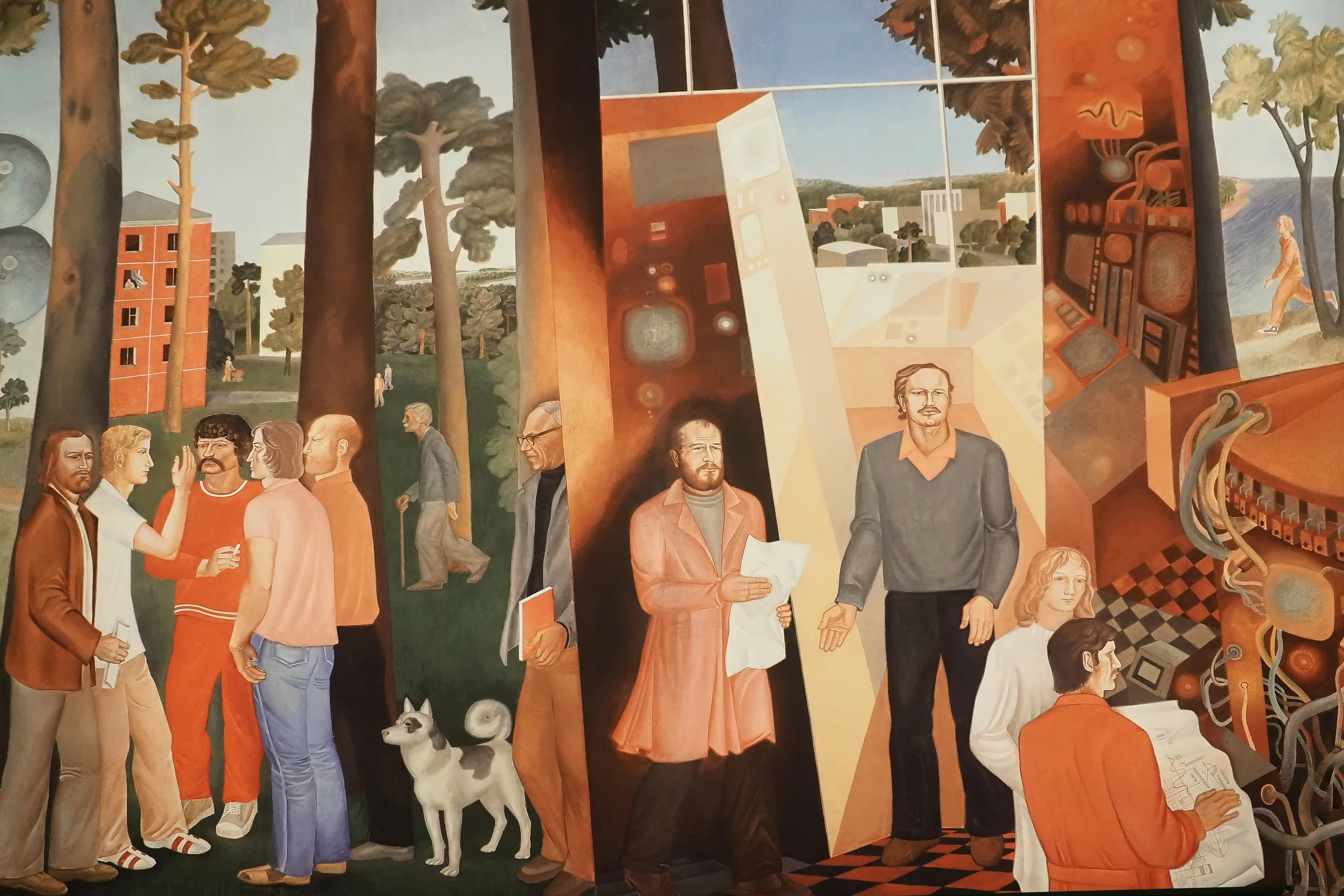 Научный прогресс влиял и на архитектуру, но параллельно с этим в стране шла борьба с архитектурными излишествами. Во втором зале экспозиции показано, как достигался компромисс. Например, в Москве это эскиз декоративного панно «Космос», «Полет в стратосферу», «Авиация» для Дворца пионеров и школьников на Воробьевых горах. Автором эскиза стал ученик Александра Дайнеки, выпускник отделения монументальной живописи Строгановского училища Алексей Губарев. А в провинции торцы безликих хрущевок украшают прообразами современных муралов. Тогда это были мозаичные панно. Например, на выставке можно увидеть эскиз монументальной росписи торца жилого дома «Человек и космос», выполненной Иваном Литовченко и Владимиром Прядко. Безусловно, в этом разделе невозможно обойти вниманием и первого космонавта Юрия Гагарина. Ему посвящена часть экспозиции второго зала. Например, фото встречи Юрия Алексеевича с коллективом первой в мире атомной электростанции в Обнинске и макет памятника Ю.А. Гагарину, установленного на площади Гагарина в Москве.