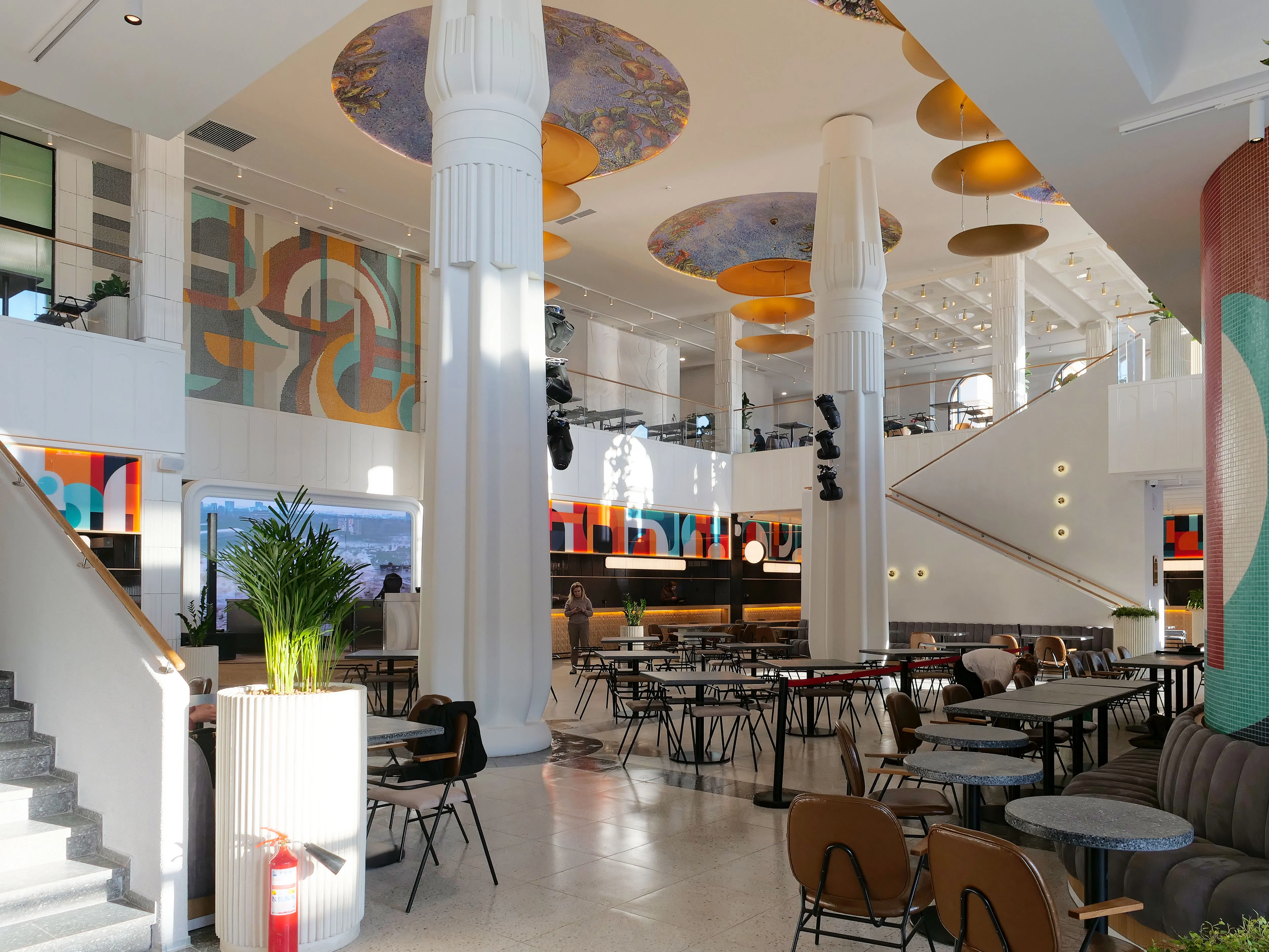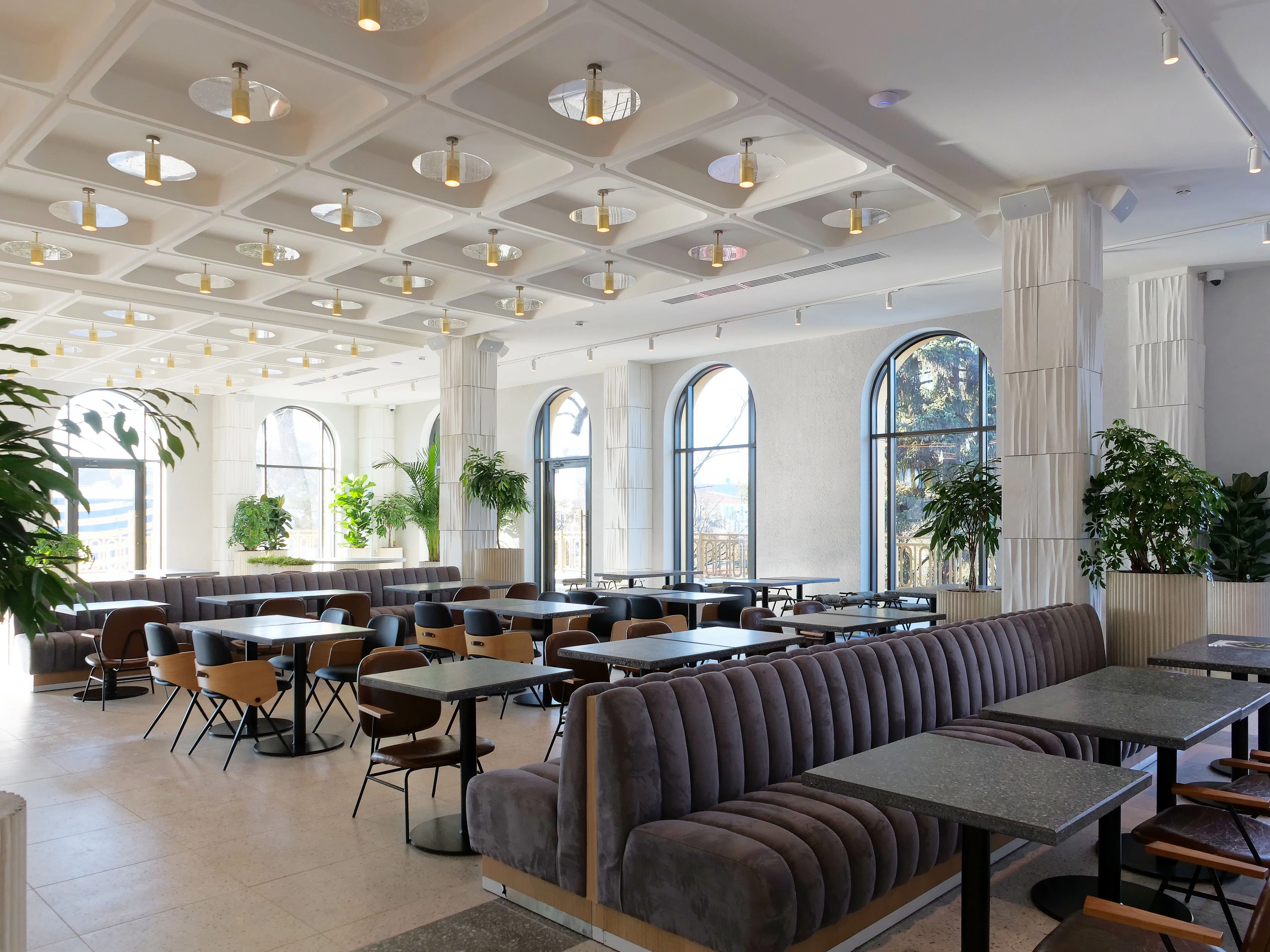 Интерьер украшают две 9-метровые «египетские» колонны из стеклофибробетона. Часть колонн облицована 3D (объемными) панелями из стеклофибробетона с уникальным рисунком. Фабрика «Мажино» произвела 256 эксклюзивных обеденных столов со столешницами из цветного бетона с супергладкой поверхностью «терраццо».