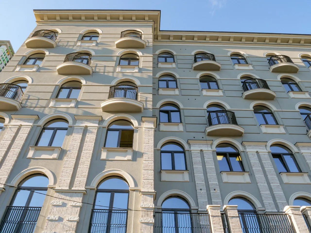 Архитектурный стиль дома Wellton SPA Residence воплощает идеи классицизма – стиля, основанного на эстетике античности. Рисунок фасада представляет стройные ряды арочных окон с французскими балконами. В отделке использован клинкерный кирпич благородного пастельного цвета. Именно такой оттенок являлся классическим атрибутом усадеб и городских построек XIX века.