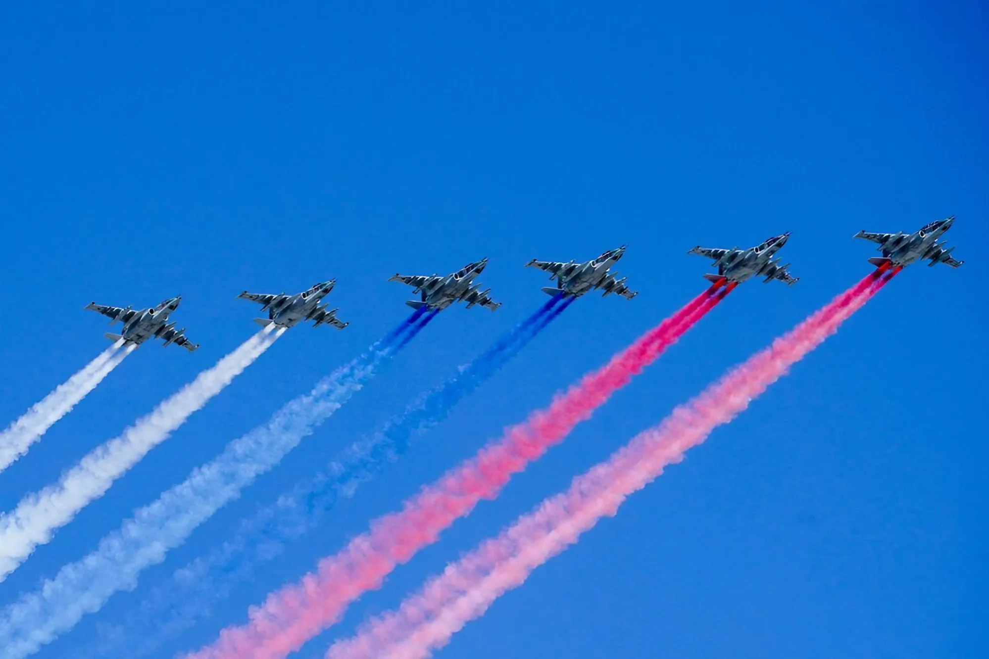 В столице уже прошли три репетиции шествия парада. В этом году состоится и его авиационная часть. Утром 2 мая в небе над Москвой жители города могли видеть не менее двух групп семейства истребителей Су-27, штурмовики Су-25 и фронтовые истребители МиГ-29. Во время полетов самолеты оперативно-тактической авиации окрасили небо в цвета российского триколора.