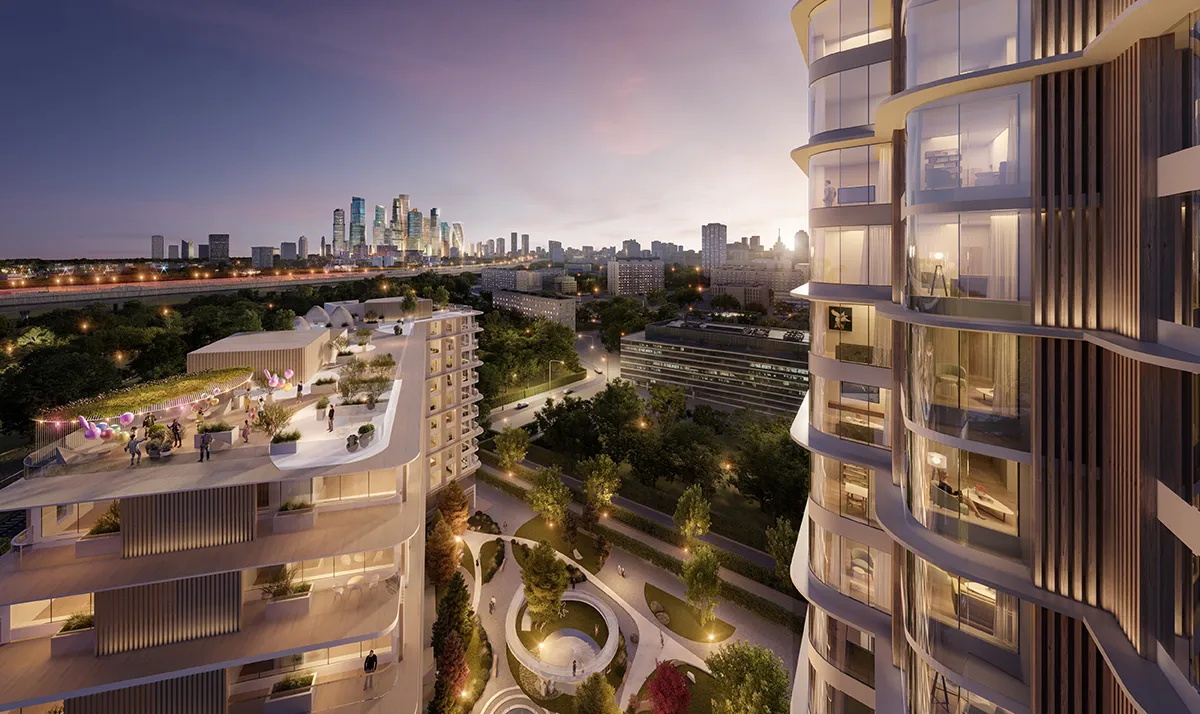 Образ флагманского проекта вдохновляет на отдых. Архитектурный облик, разработанный старейшим японским бюро Nikken, напоминает морской лайнер: ступенчатые террасы фасадов, моллированное угловое остекление, горизонтальные деки. Атмосферу путешествия поддерживает благоустройство. Во дворе появятся прогулочные пространства с ландшафтной подсветкой, смотровая площадка в виде парящего моста, а на небольшой уютной площади разобьют сад в стиле традиционных японских парков – с водоемом и природным амфитеатром.