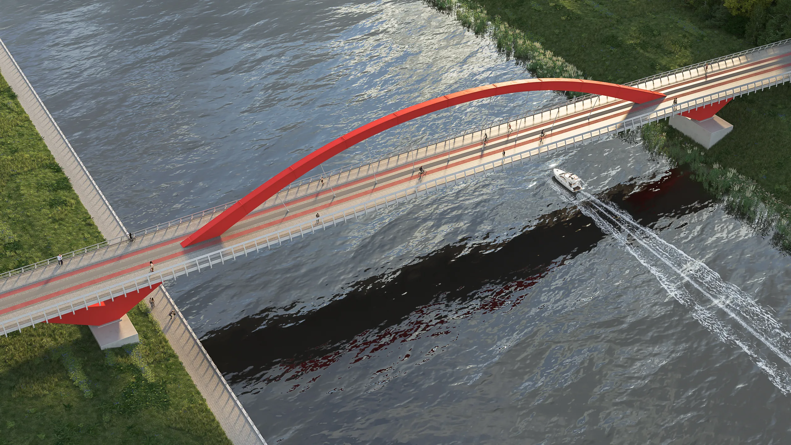 Красный цвет планируется использовать в дизайне трех других мостов Мнёвниковской поймы – двух автомобильных и еще одного пешеходного, а также при создании надземного перехода через улицу Нижние Мнёвники.