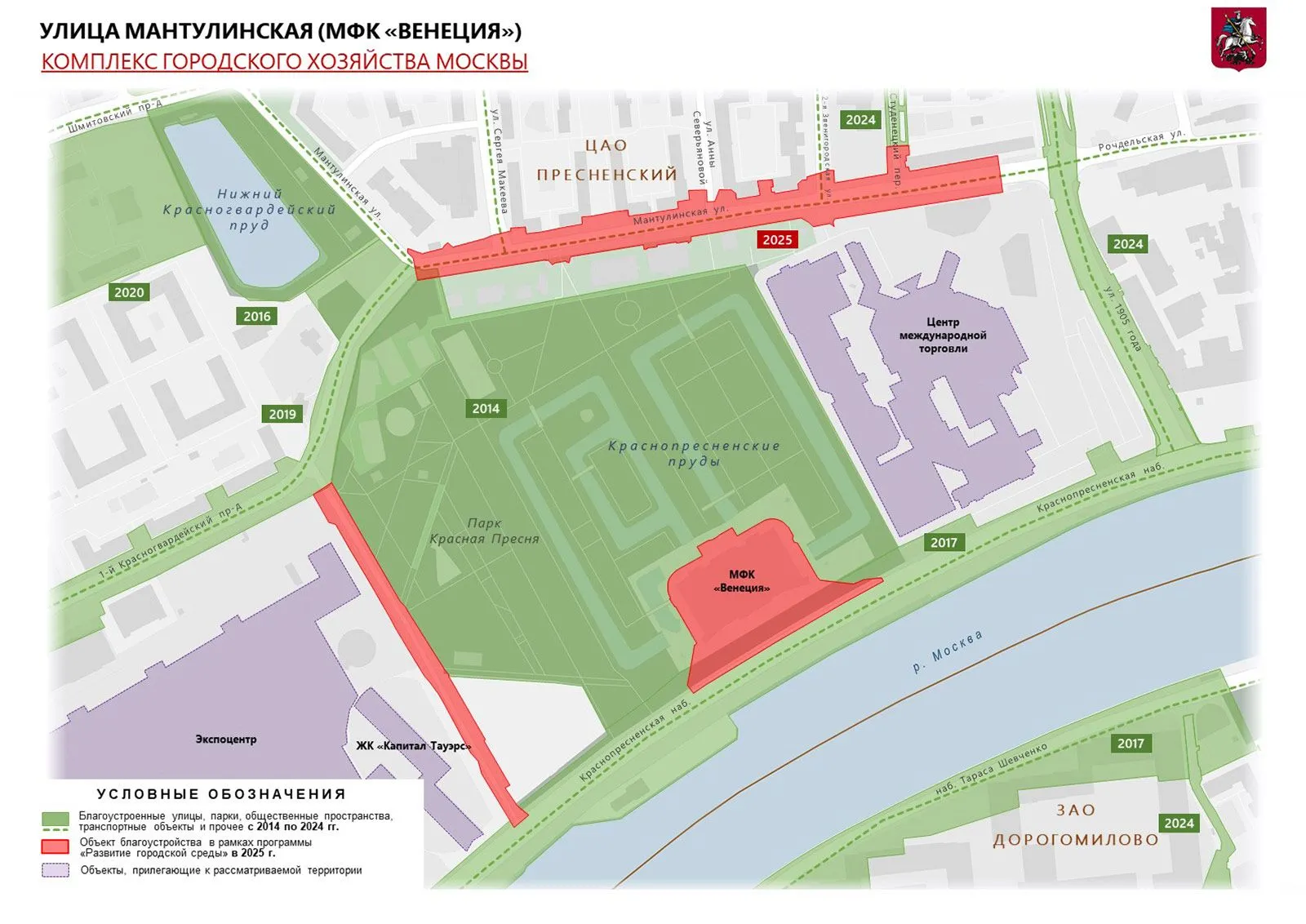 Краснопресненская набережная стала местом для отдыха и спорта, оборудованным шезлонгами и тенистыми зонами. Вдоль Красной Пресни и Звенигородского шоссе расширили тротуары, вымостили их гранитом и высадили более 200 деревьев.