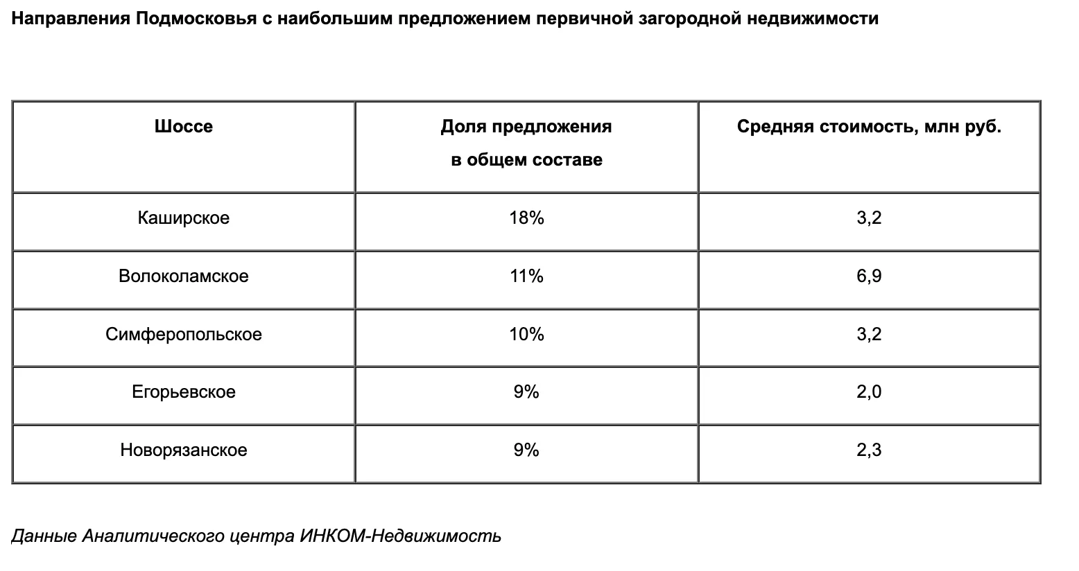 Аналитики компании составили список из пяти направлений с наибольшим количеством первичных объектов: совокупно здесь сосредоточено 57% экспозиции. Так, лидером является Каширское шоссе с 18% лотов в общем объеме; на втором месте Волоколамское с 11%; далее Симферопольское с 10%; за ним следуют Егорьевское и Новорязанское шоссе – у каждого из них по 9%. На четырех направлениях из топ–5 самая низкая в Подмосковье средняя стоимость первичного загородного предложения: на Егорьевском шоссе 2 млн руб., на Новорязанском 2,3 млн руб., на Каширском и Симферопольском 3,2 млн руб. На Волоколамском дороже – медианная цена лота составляет 6,9 млн руб.