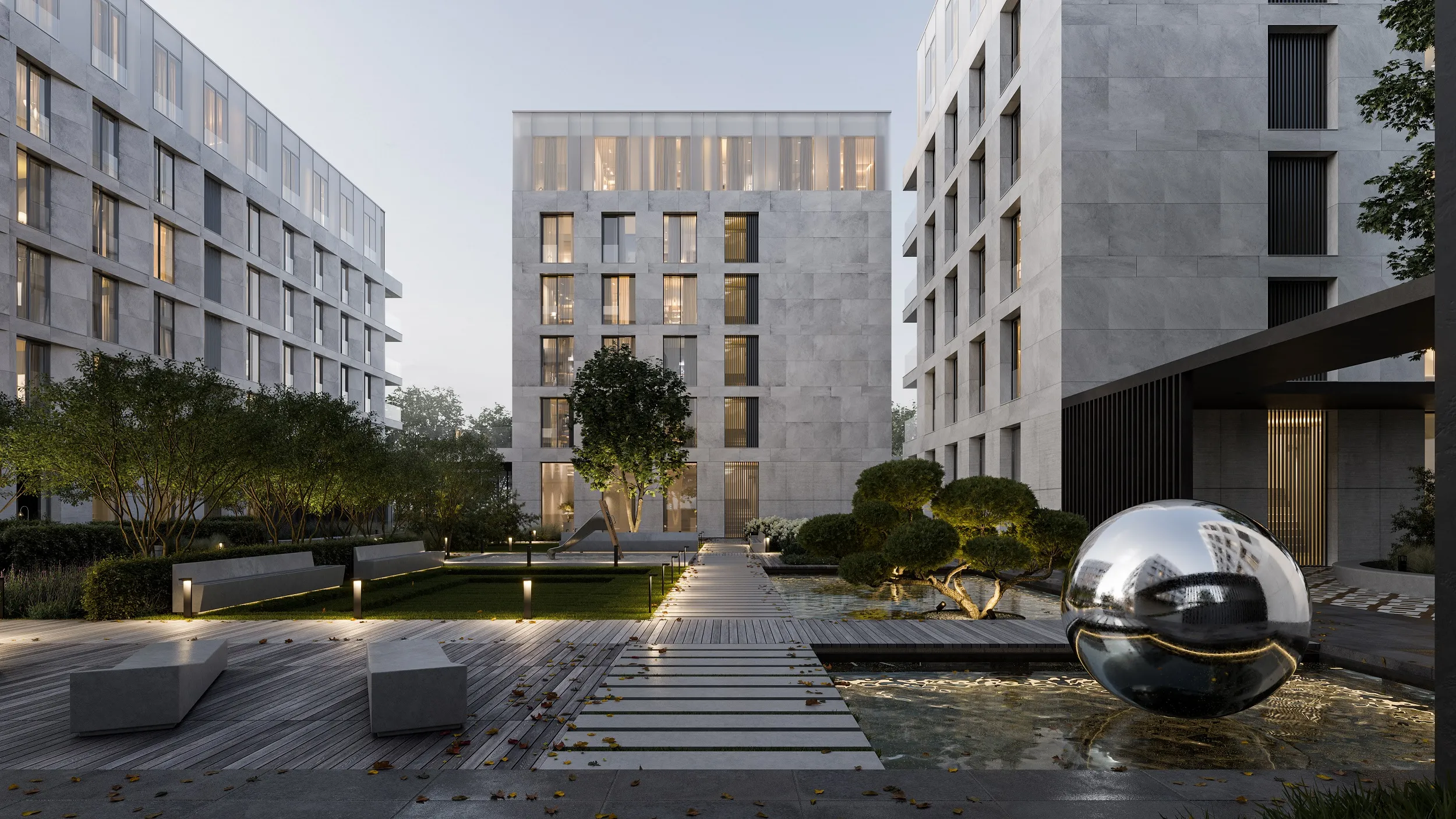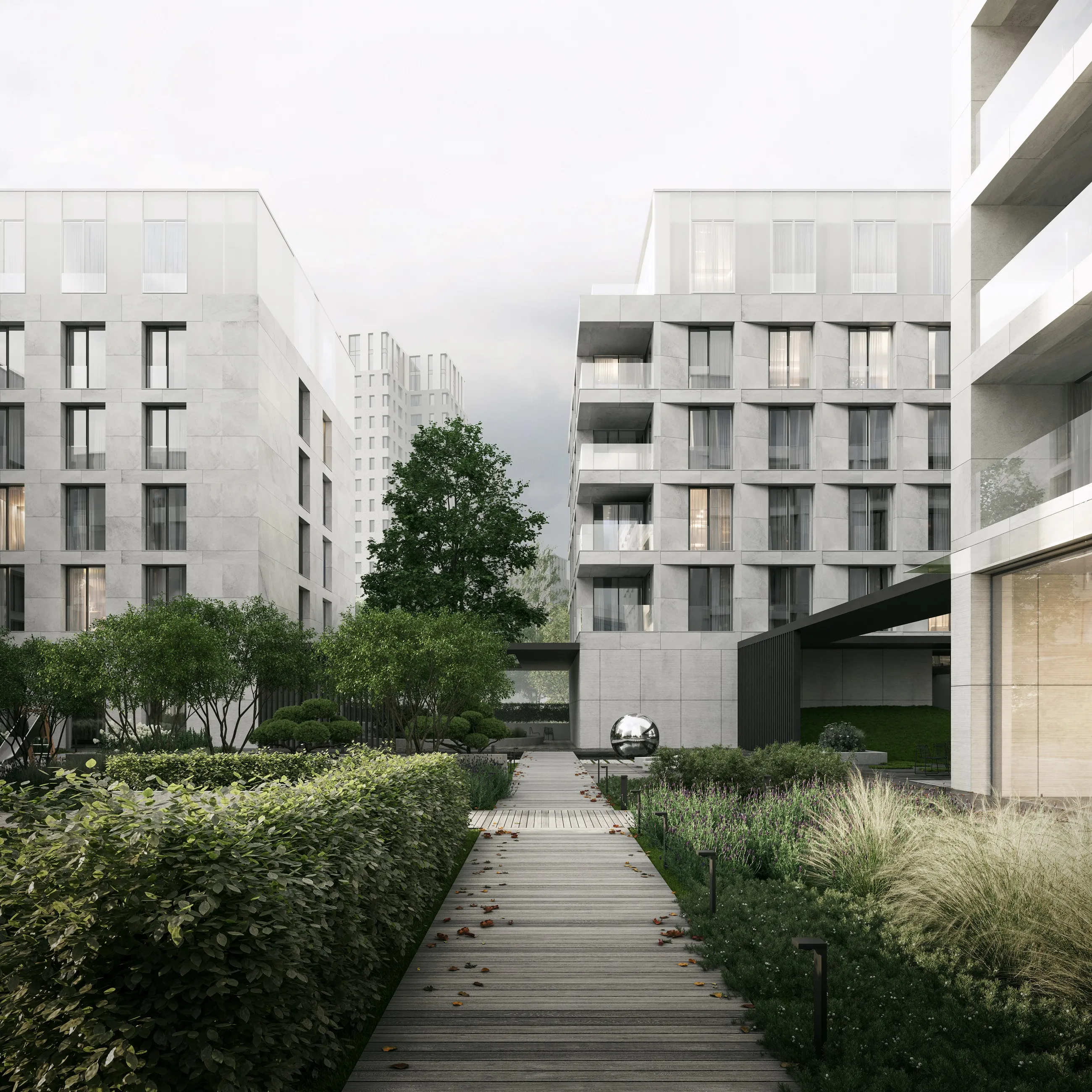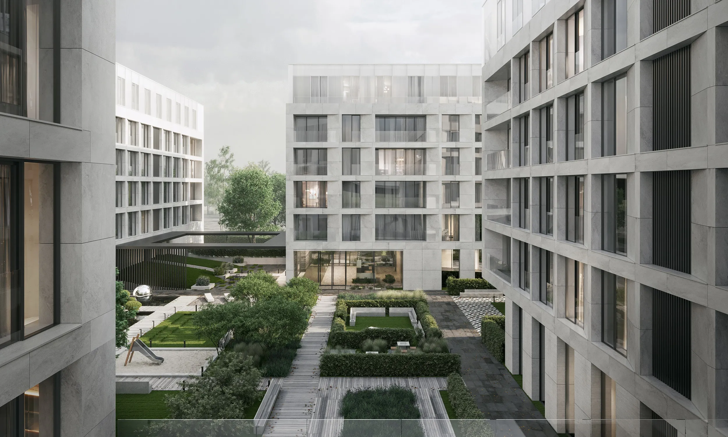 Внутренний двор будет закрытым. Также здесь появится библиотека. Лобби каждого корпуса в составе ЖК будут украшены арт-композициями.