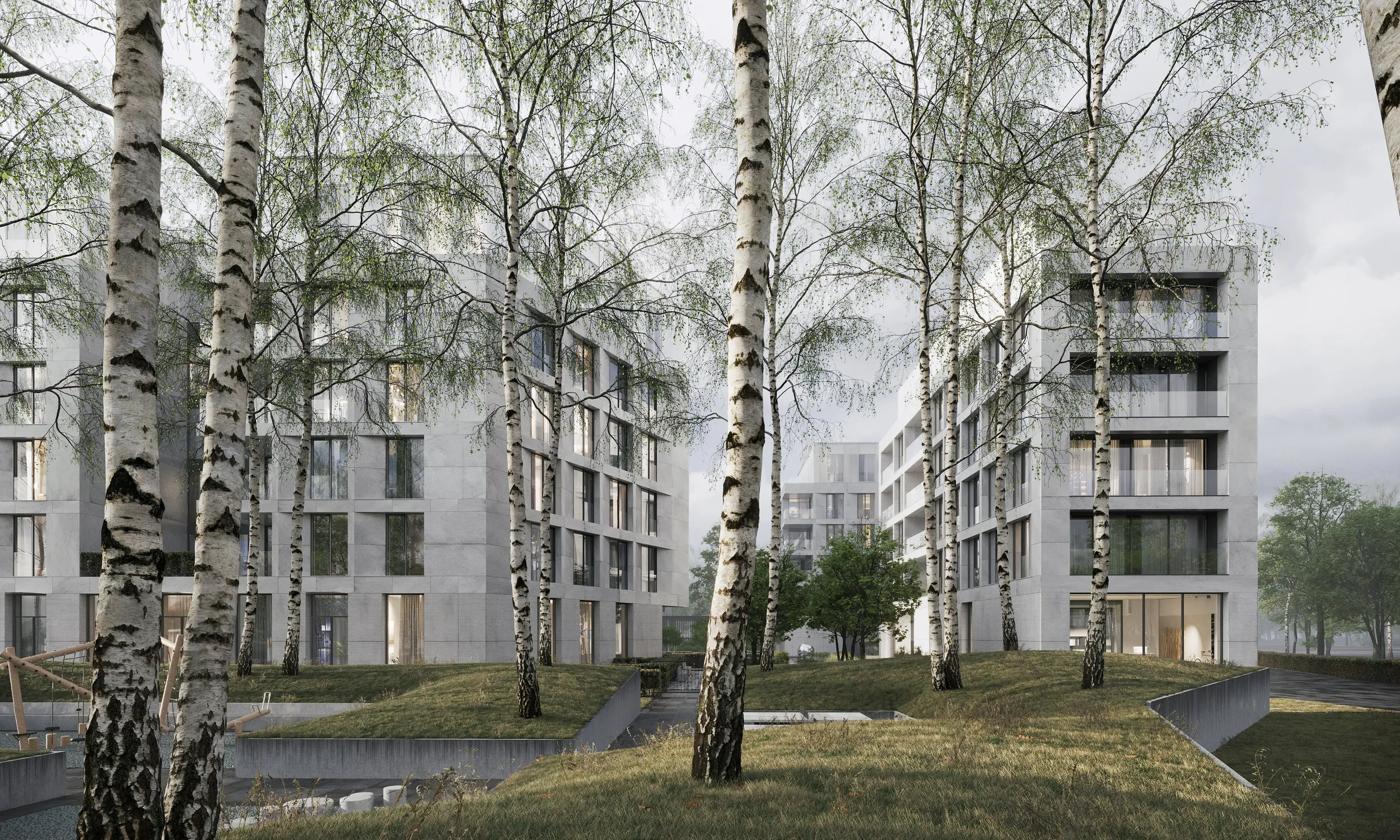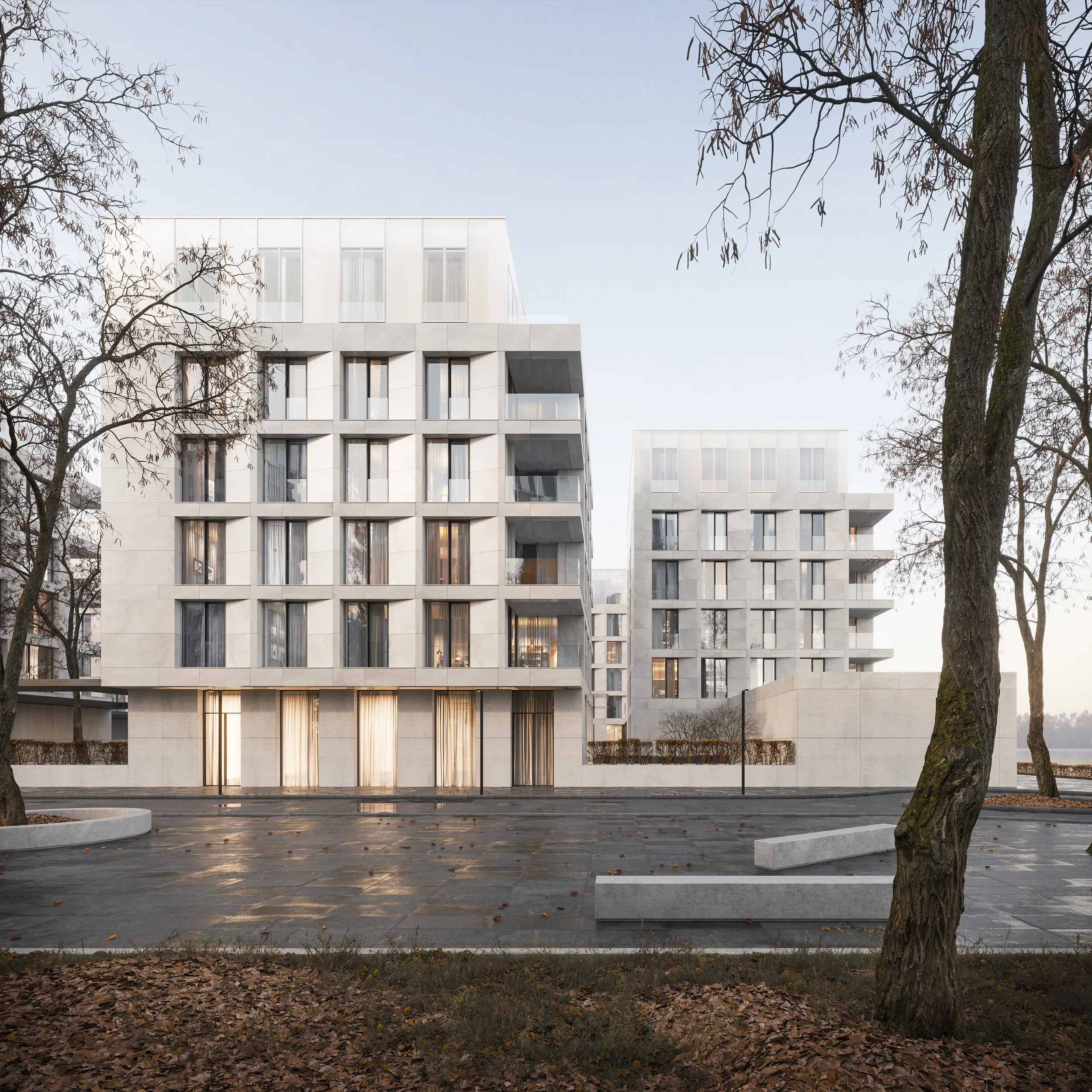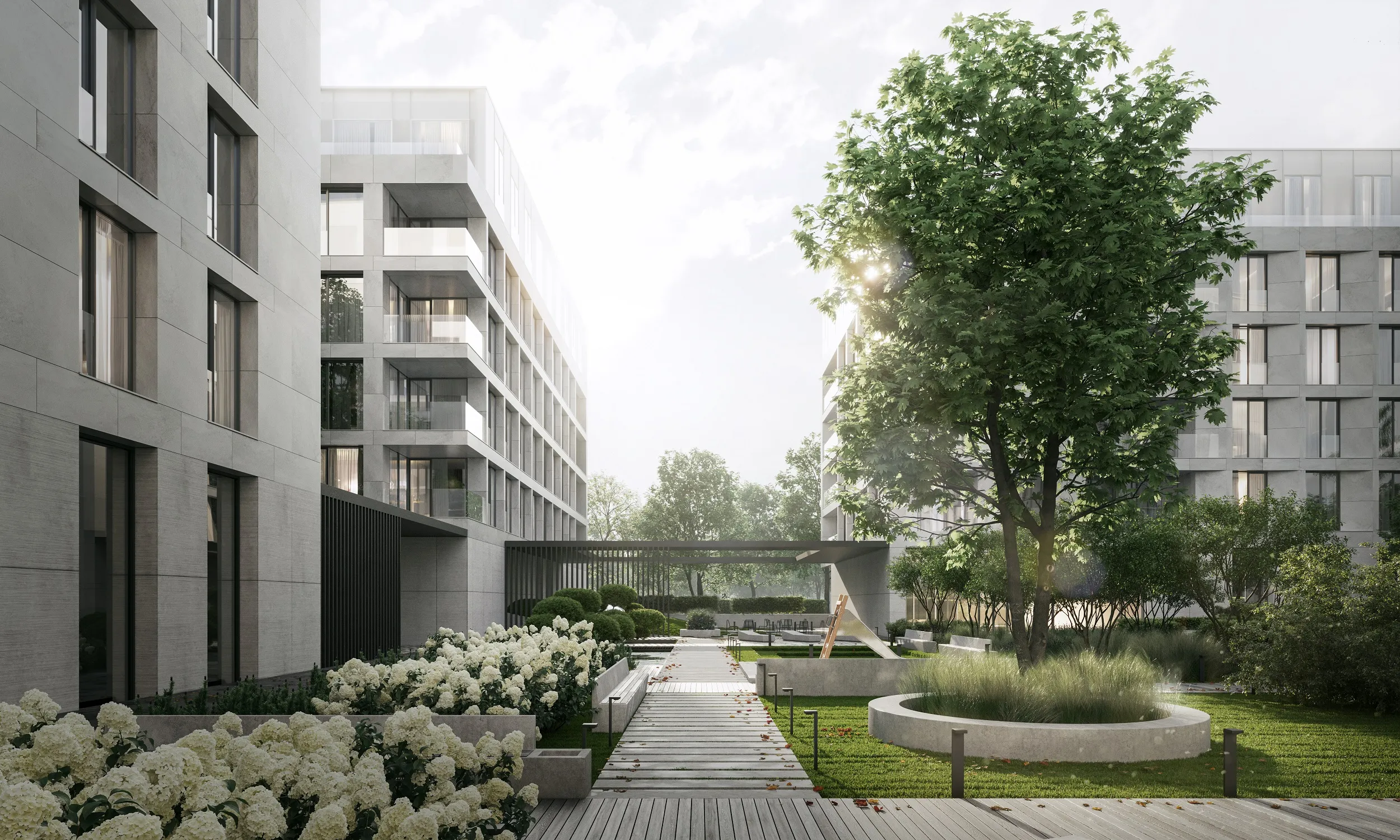 «Композиция из пяти корпусов пропускает максимум света, воздуха и неба во внутренний двор, и одновременно с этим обеспечивает приватность, камерность и уют. Сад станет основным местом отдыха и уединения, здесь предусмотрено несколько разных по восприятию и наполнению пространств. По его периметру пройдет променад, который соединит между собой жилые корпуса. Со стороны набережной будет расположен одноэтажный объем, формирующий фронт набережной Москва-реки. В стилобате расположатся небольшие кафе, студии и бутики», – рассказал Сергей Кузнецов.