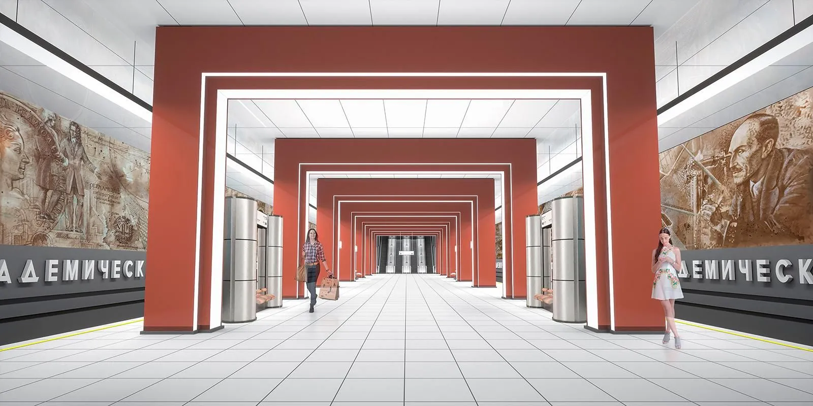 Центральную часть платформы «Академическая» украсит череда порталов, грани которых будут подсвечиваться. Эти архитектурные элементы станут основным источником освещения платформы.