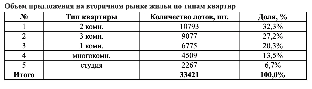На долю многокомнатных квартир (четыре комнаты и более) приходится 13,5%, что составляет 4,5 тыс. лотов площадью 828,4 тыс. кв. м