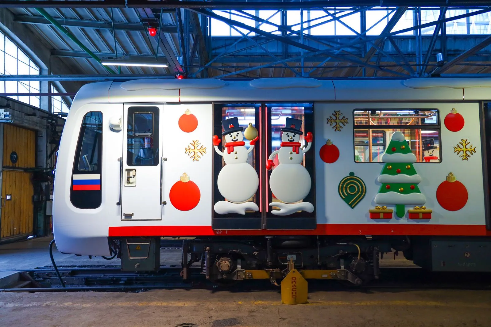 В Московском метрополитене запустили новогодний поезд на Кольцевой линии. Все его вагоны украсили атрибутами зимы. На составе разместили более 700 объемных фигур — снеговиков, елки, снежинки, елочные шары.