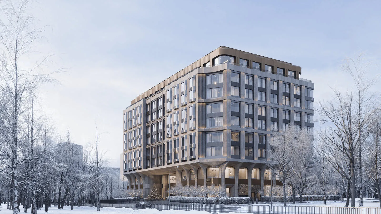 Фасад здания будет выполнен с помощью навесной вентилируемой системы. Основным облицовочным материалом станут крупноформатные панели из светлого натурального камня, которые дополнят декоративные элементы из анодированного алюминиевого композита. Для визуального акцента в темное время суток предусмотрена архитектурная подсветка.