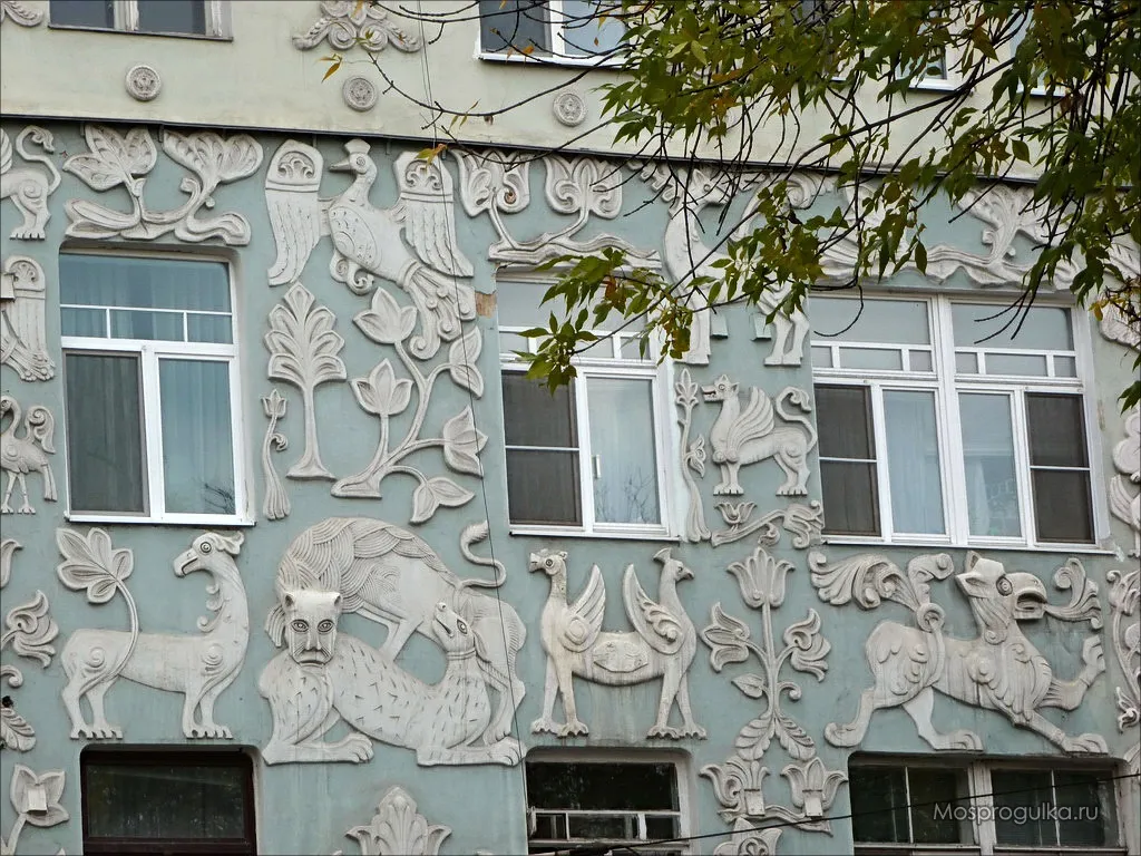 На Чистых прудах есть потрясающий жилой дом, который в народе так и называют: дом со зверями. Построен он в 1908–1909 годах по проекту архитектора Льва Кравецкого и инженера-строителя Петра Микини. Деньги на возведение здания дала Церковь – это должен был быть доходный дом при храме Троицы Живоначальной на Грязех у Покровских ворот. Построенное в начала ХХ века, здание приобрело известность благодаря уникальным барельефам фантастических животных. На фасаде можно разглядеть сов и уток, грифонов, драконов, львов, химер, необычные растения и цветы, а некоторым существам сложно даже подобрать название. Барельефы выполнены по эскизам московского художника Сергея Вашкова, ученика Виктора Васнецова – одного из признанных мастеров русского модерна. Они появились неслучайно – Вашков, будучи специалистом в области религиозного искусства, был восхищен средневековыми барельефами на стенах Дмитриевского собора города Владимира. Они-то и стали прототипом мифических существ, заселивших фасад доходного дома.