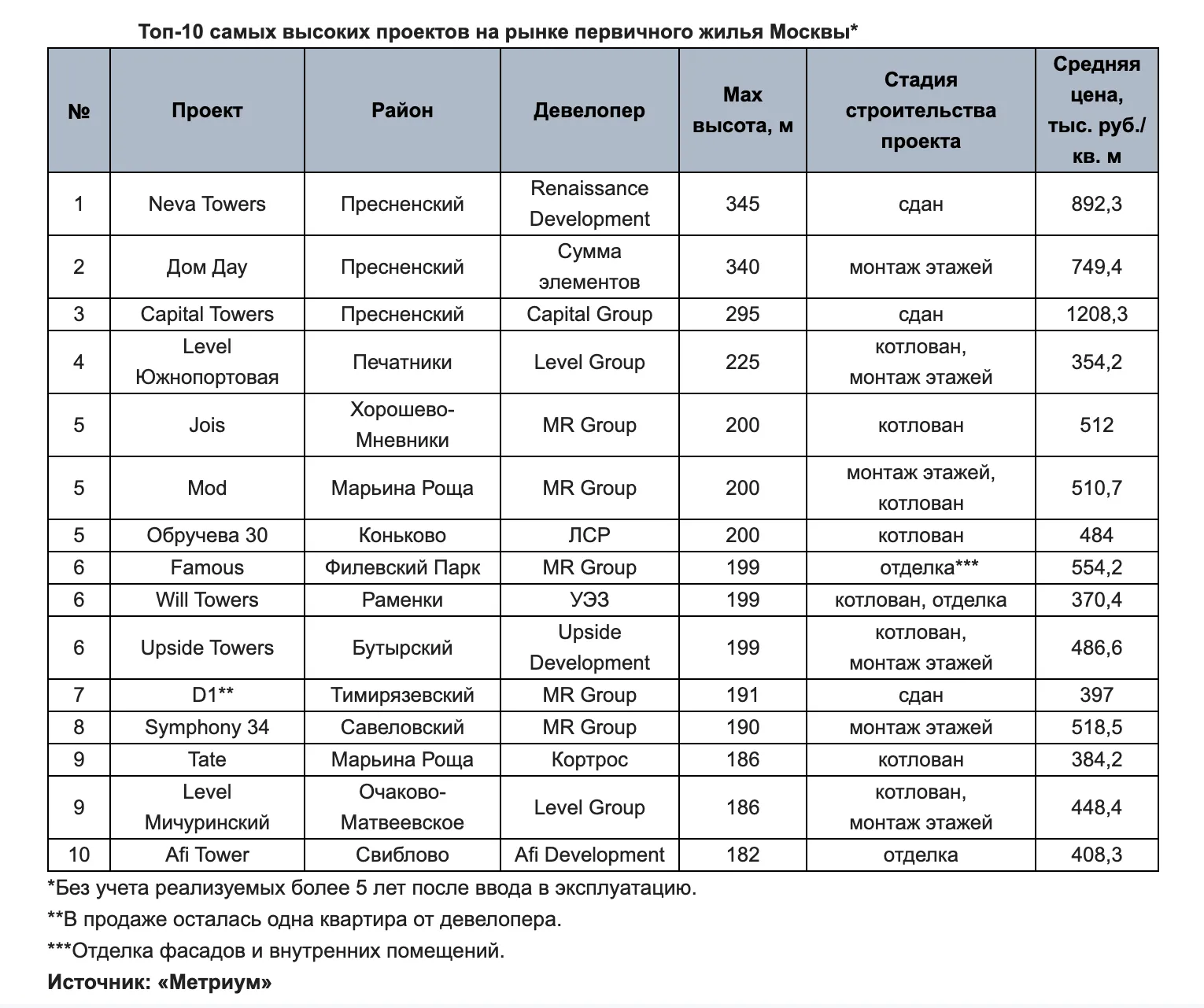 Из рейтинга исключен небоскреб «ОКО» (354 м), так как данный комплекс введен в эксплуатацию более 8 лет назад, что не позволяет считать проект новостройкой. Теперь лидер по высоте – апарт-комплекс премиум-класса Neva Towers (Пресненский район) от Renaissance Development, достигающий в высоту 345 метров (77 этажей). Средняя цена квадратного метра в этом проекте – 892,3 тысяч рублей.