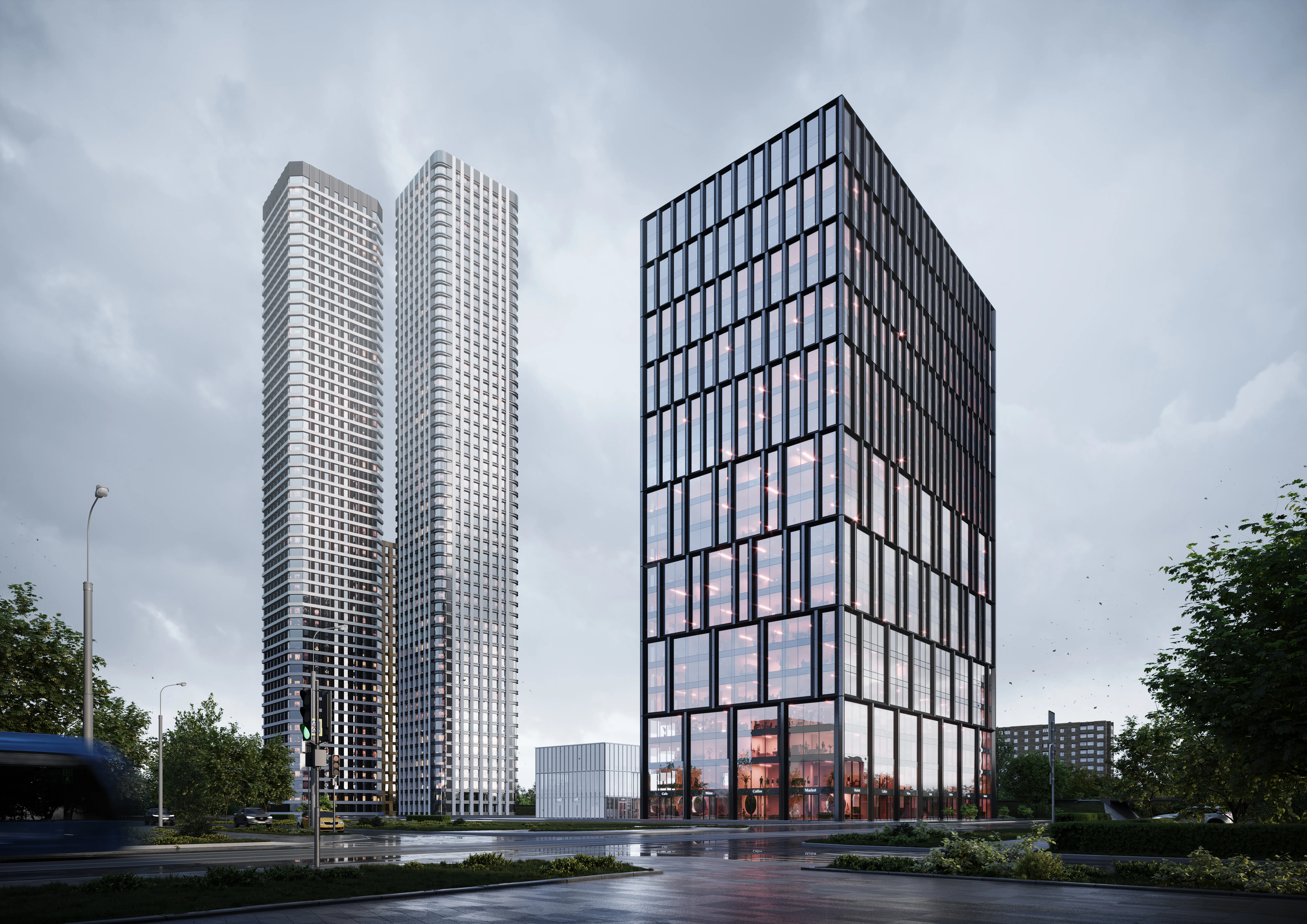 Между бизнес-центром и торговой галереей запроектирован открытый благоустроенный бульвар, который создаст новые пешеходные маршруты для жителей окружающих домов до метро и МЦД и станет новой инфраструктурной точкой притяжения.