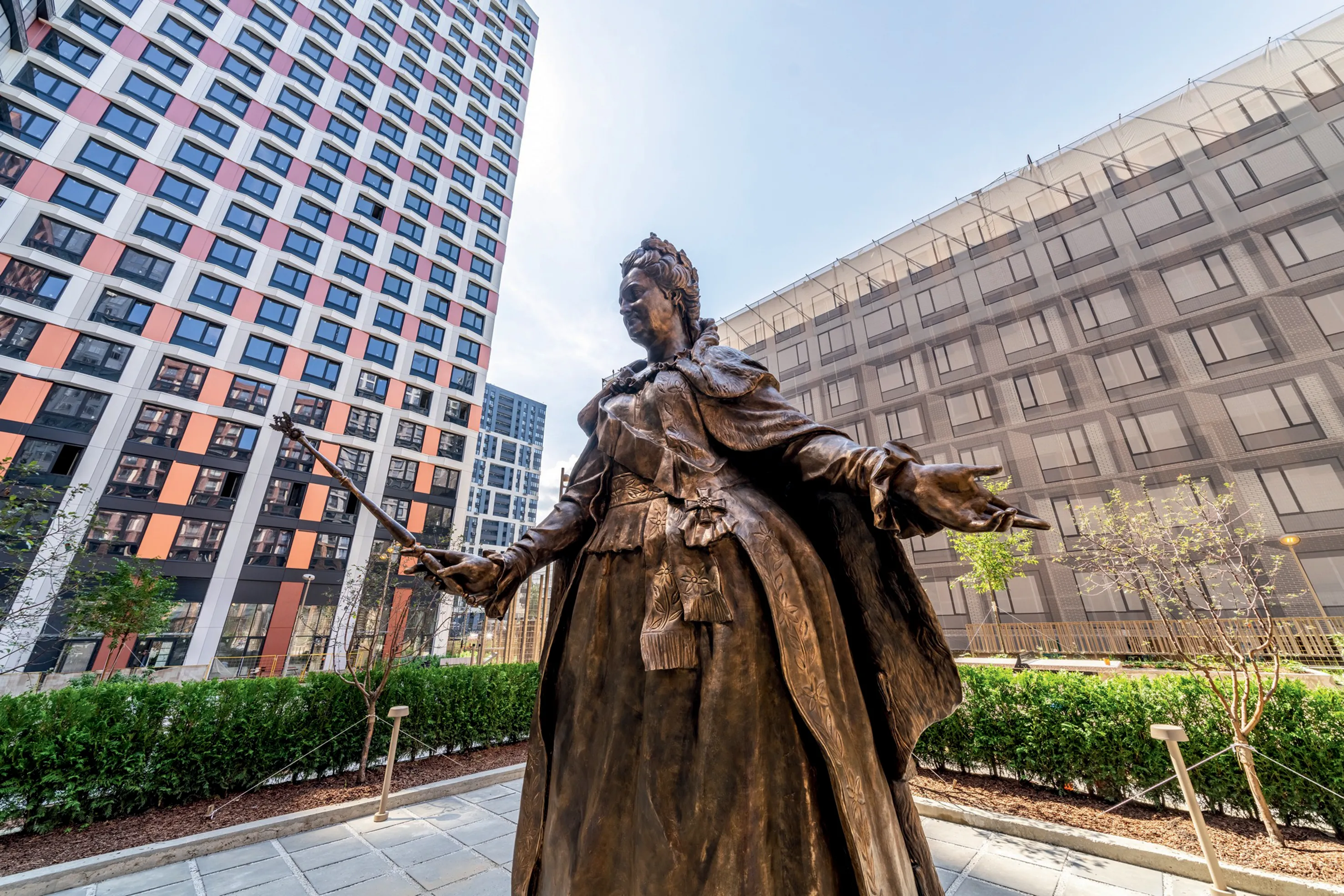 Скульптура Екатерины II – это не просто декоративный элемент. Это символическое возвращение истории на карту современной Москвы. Именно при Екатерине Великой в конце XVIII века заложили Петровский путевой дворец – ныне это одна из архитектурных жемчужин района и знаковый ориентир вблизи нового жилого комплекса. Выбор фигуры императрицы неслучаен: как мудрый реформатор и покровитель искусств, Екатерина II стала воплощением идеи гармоничного соединения культурного наследия и современного градостроительства. Скульптура выполнена в традиционной академической манере.