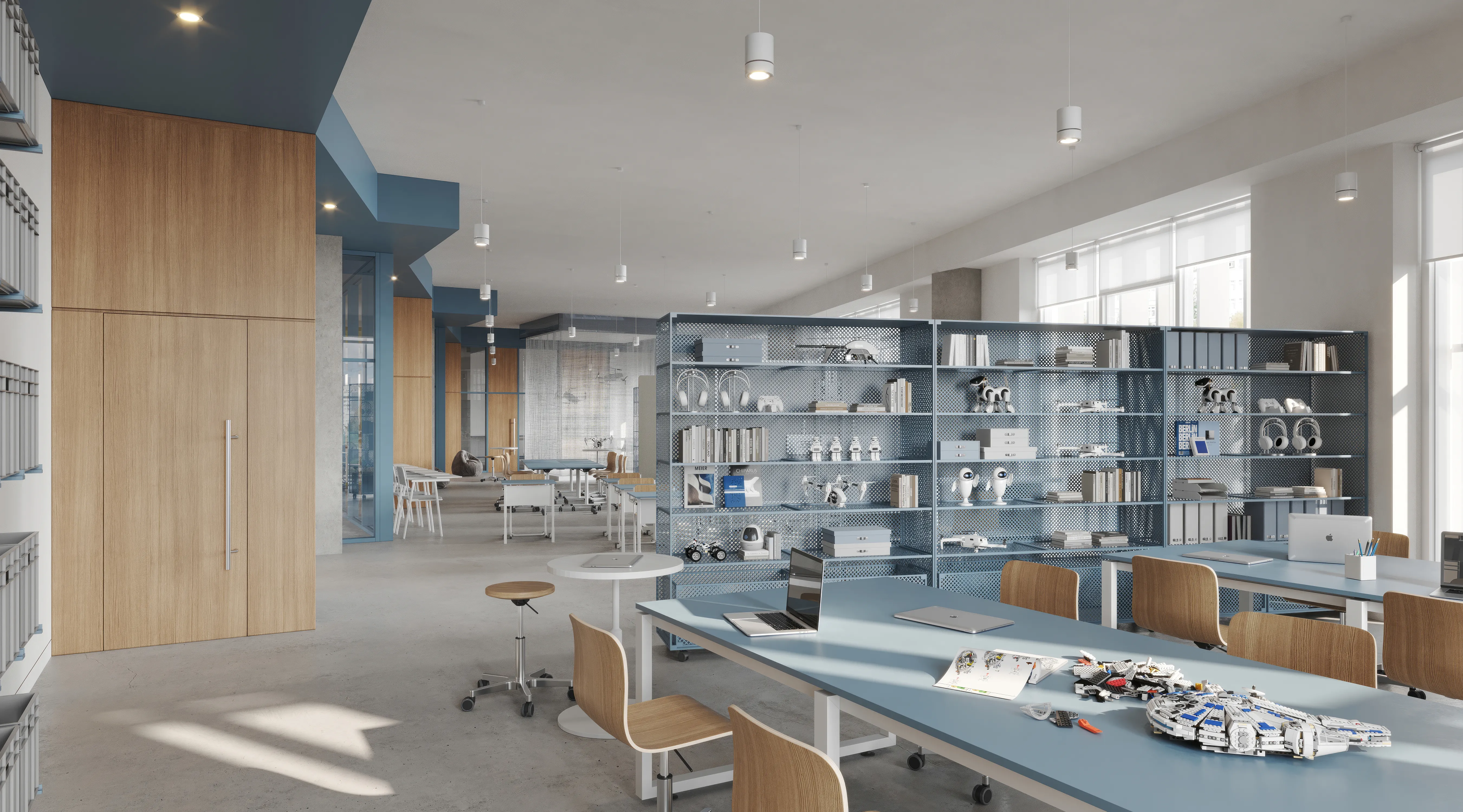 Блок дополнительного образования объединяет сразу несколько пространств по разным направлениям. Среди них — естественно-научные лаборатории для практикумов по биологии, химии и медицине, а также IT-полигон с зонами для программирования, анализа данных и робототехники. Для творческих занятий предусмотрены производственные мастерские с ЧПУ-станками, медиастудия профессионального уровня для фото- и видеосъемки, графического дизайна и записи подкастов, а также художественные мастерские.