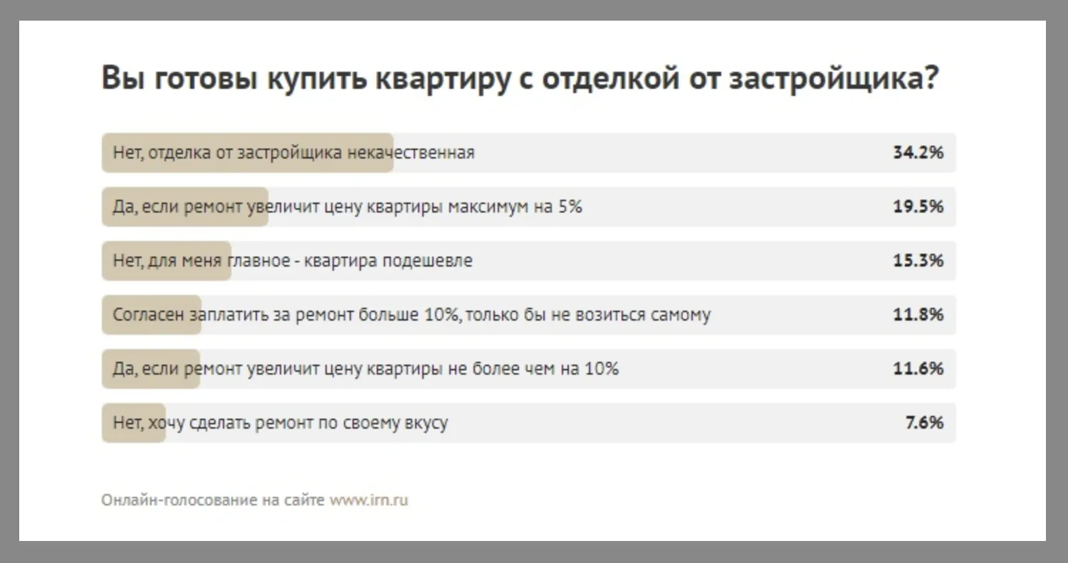 Категорично против ремонта от застройщика выступили 57,1% проголосовавших. Но причины у всех разные. Большинство опрошенных – 34,2% – не устраивает качество отделки от застройщика. 15,3% аргументируют свое решением тем, что им важна низкая стоимость квартиры, а ремонт увеличивает ее. Еще 7,6% отказались от отделки, так как хотели бы сделать ремонт по своему вкусу.
