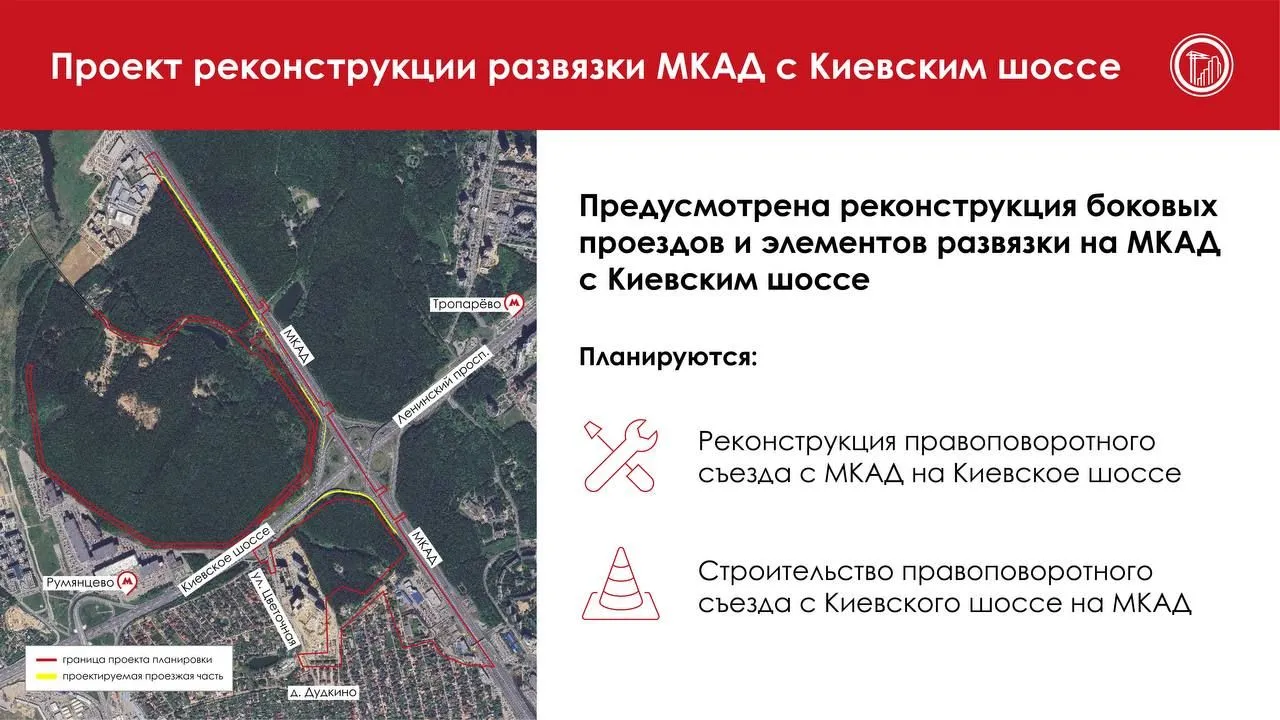 Речь идет об участке МКАД от 44 до 47-го километра. Проект предусматривает строительство и реконструкцию примерно четырех километров дорог. В частности, в составе развязки Московской кольцевой автомобильной дороги с Киевским шоссе реконструируют правоповоротный съезд с МКАД на Киевское шоссе. Там построят новый правоповоротный съезд с Киевского шоссе на МКАД (ориентировочная протяженность – 450 метров, одна полоса движения в одном направлении).