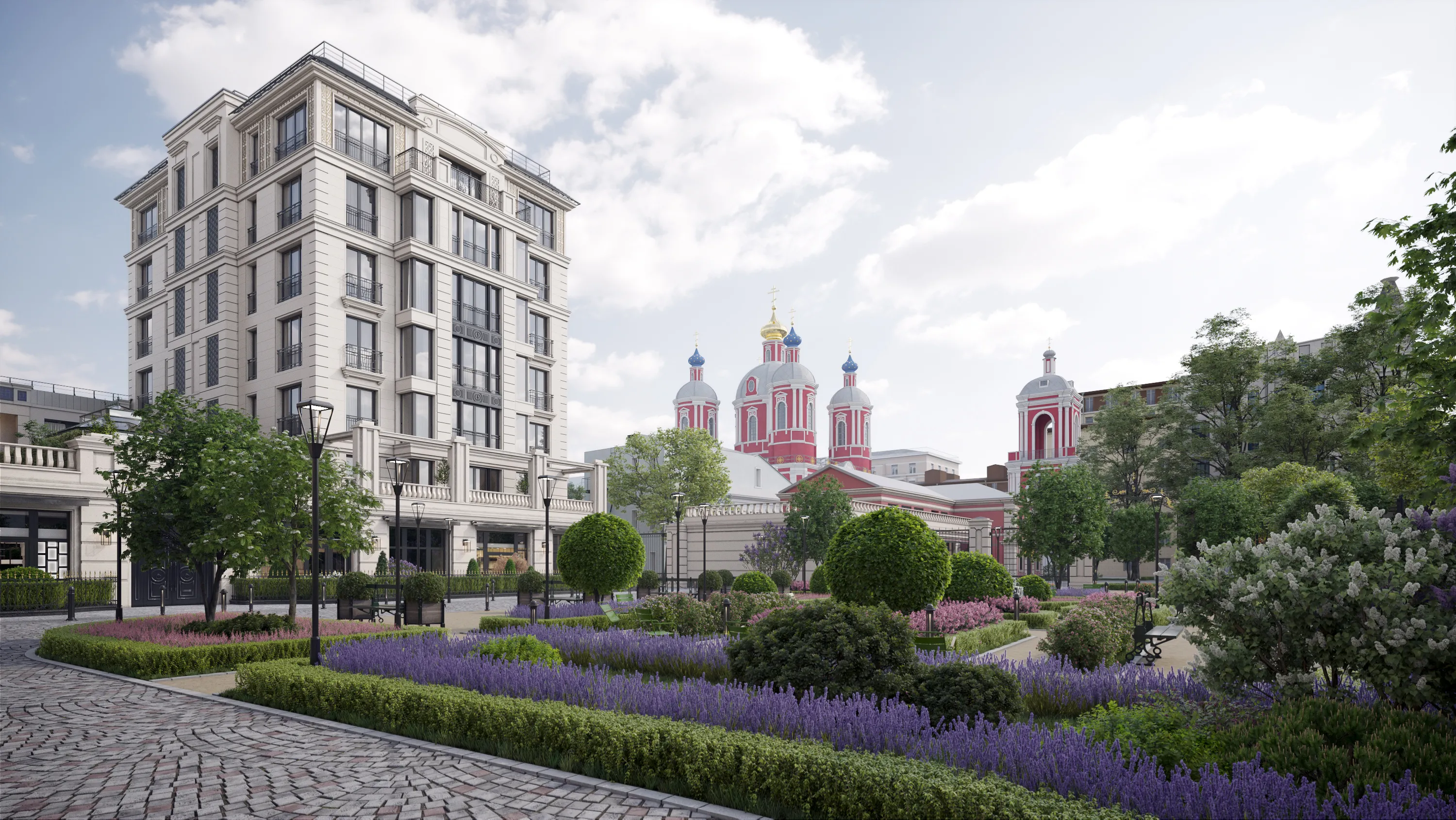 Роскошный приватный парк во французском стиле, занимающий огромную территорию, встречает жителей регулярной симметричной композицией, богато украшенным парковым ансамблем, где эстетика является продолжением величественных и в то же время теплых каменных фасадов. Португальский известняк, играющий в лучах утреннего солнца, приветствует прогуливающихся по аллее. Панорамные окна в пол, дополненные выполненными по индивидуальному дизайну балконными ограждениями, отражают ясное небо, впускают солнечный свет внутрь трехсторонне ориентированных квартир.
