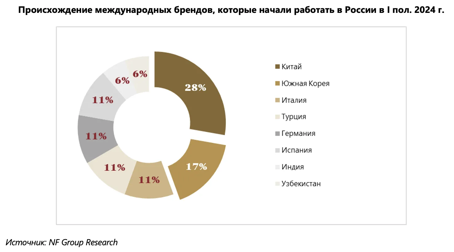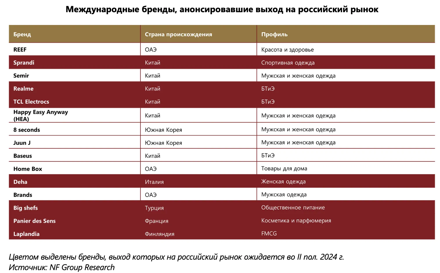 С начала года на российский рынок вышли 18 международных брендов, еще 15 брендов анонсировали выход. Во втором полугодии начнут работать не менее семи новых иностранных ретейлеров. Активно выходят азиатские бренды, в основном из Китая и Южной Кореи. Также в России уже открылись либо анонсировали открытие бренды из Италии, Испании, Германии, Турции, Индии и Узбекистана. Большинство новых международных брендов занимаются производством одежды и аксессуаров (67%), спортивной одежды (11%), технологий и телекоммуникаций (11%), товаров для детей (6%) и товаров для дома (6%).