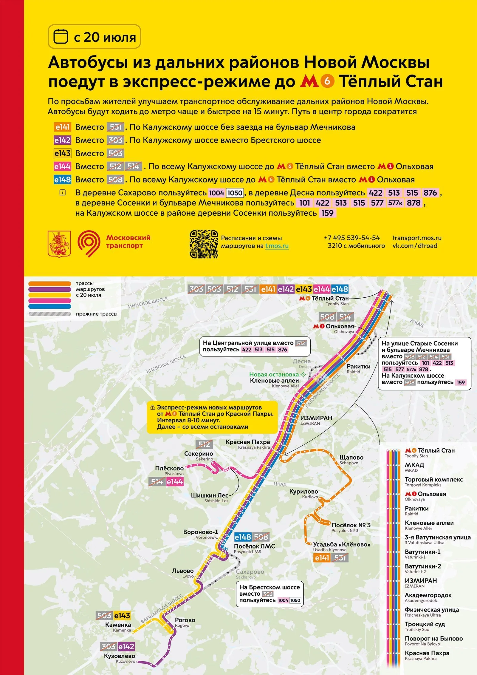 Пять новых экспресс-маршрутов организовано от станции метро «Теплый Стан»: маршрут Е141 — до усадьбы Кленово, Е142 — до Кузовлева, Е143 — до Каменки, Е144 — до Плескова с заездом в Секерино и Е148 — с конечной остановкой в поселке ЛМС.