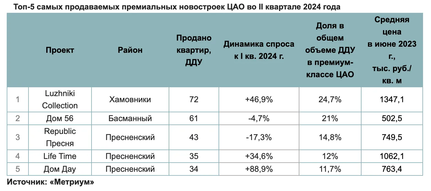 Самые продаваемые премиальные новостройки ЦАО во II квартале