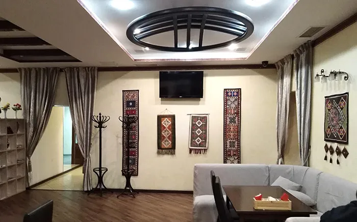 Ресторан работает на первом этаже — его без труда можно различить по настенному ковру высотой с дачный дом. Днем в ресторане обычно обедают гражданские постояльцы Гостевого дома, а вот вечером здесь можно встретить шумные компании азербайджанских военнослужащих. Это самое дешевое место в окрестностях Тверской, где можно пообедать: все салаты стоят ₽80, супы ₽100, мясные блюда ₽70, а гарниры — всего ₽10 р. За ₽60 официант принесет стакан гранатового сока или заварит эспрессо, а минеральная вода обойдется немногим дороже, чем в магазине (₽150 за бутылку «Боржоми»).