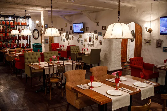 У этого ресторана есть одна особенность — в нем делают несколько перерывов в день, которые сложно понять большинству москвичей, например, зал будет закрыт с 16 до 18 часов. Интерьеры ампирные, отдающие советским прошлым, местами с эстетикой из девяностых, залы просторные, персонал вежливый, но не всегда быстрый. Редко — но такое все же случается — некоторых позиций, указанных в толстом меню, может не оказаться. Еще реже зал закрывают на банкетное обслуживание.