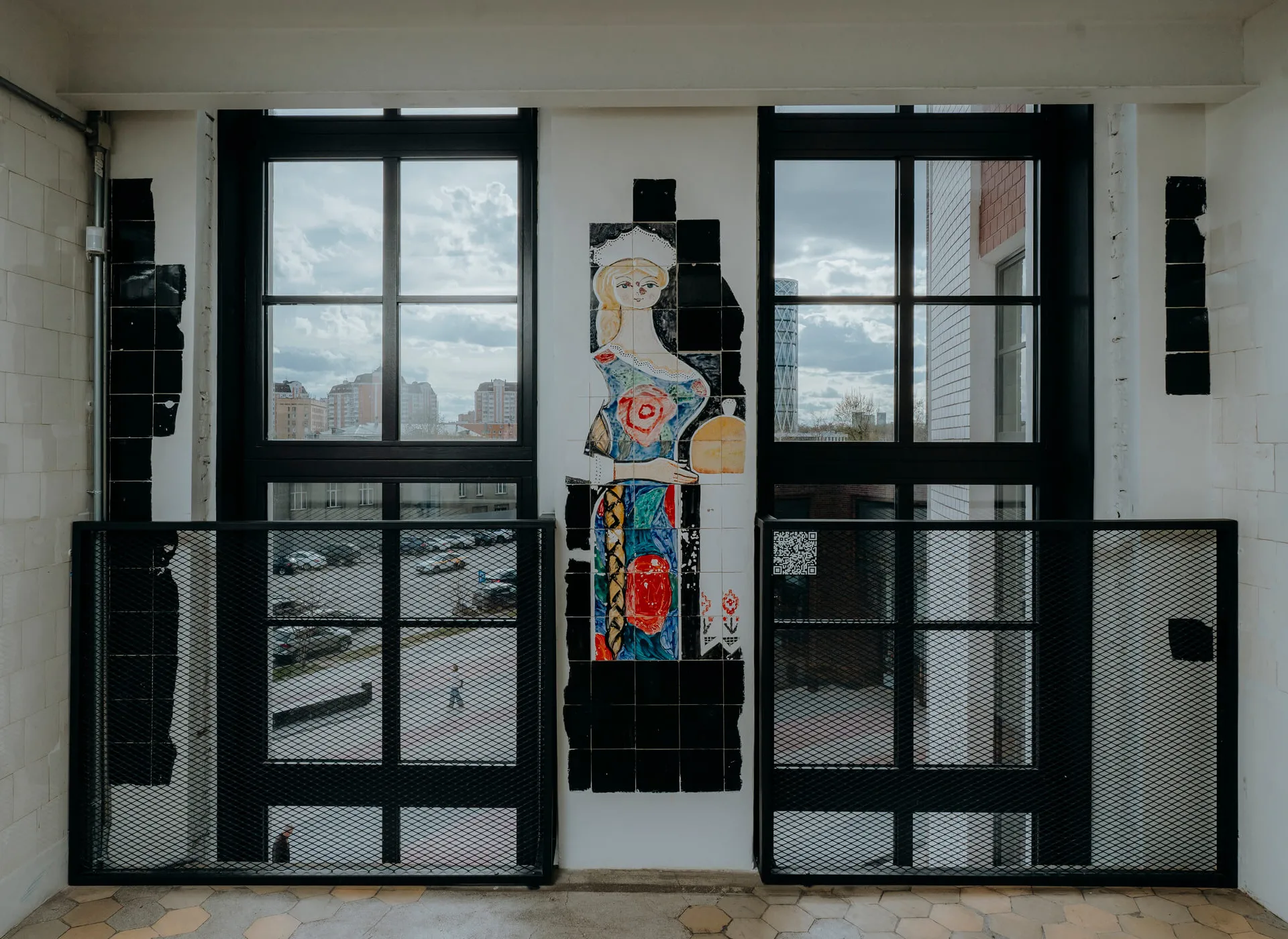 Бережно поступили и с настенным панно, созданным примерно 40 лет назад. Поднимаясь по лестнице, посетители видят наивное изображение пышногрудой красавицы с русой косой и караваем, нарисованное прямо по белому кафелю. Реставраторы обновили потускневшие с годами краски, придав им сочности, но оставили приметы времени в виде щербинки на носу. На первом этаже сохранили аутентичные потолок и кирпичные стены. Проемы нескольких окон удлинили до пола – летом их открывают. Получается безбарьерное пространство в виде круглой крытой площади. Выставочные витрины верхних этажей для мобильности поставили на колеса. Их удобно, словно ширму, передвигать или собирать в цепочки разной длины и конфигурации. Плашки для подписей многоразовые, на магнитных креплениях.