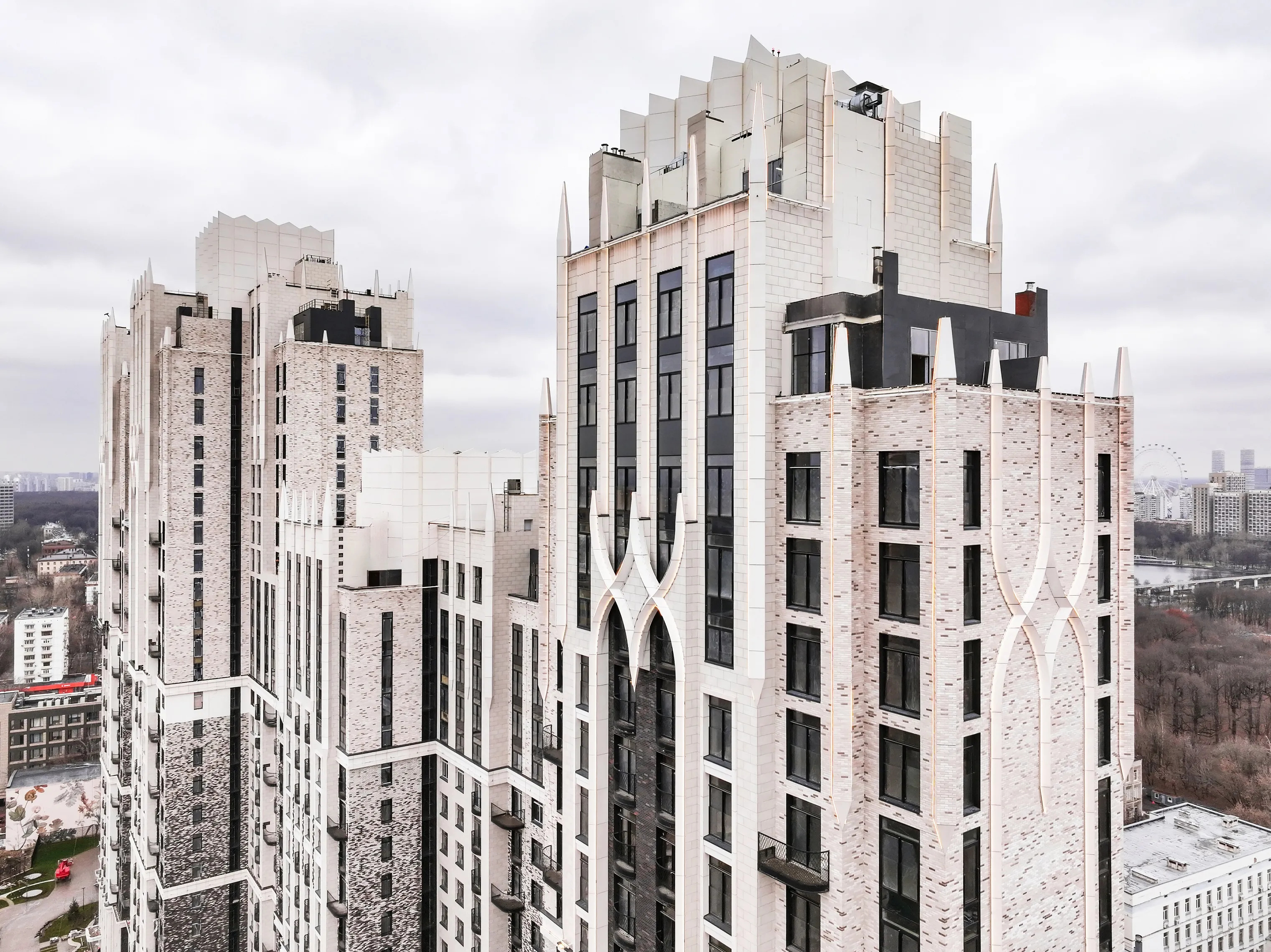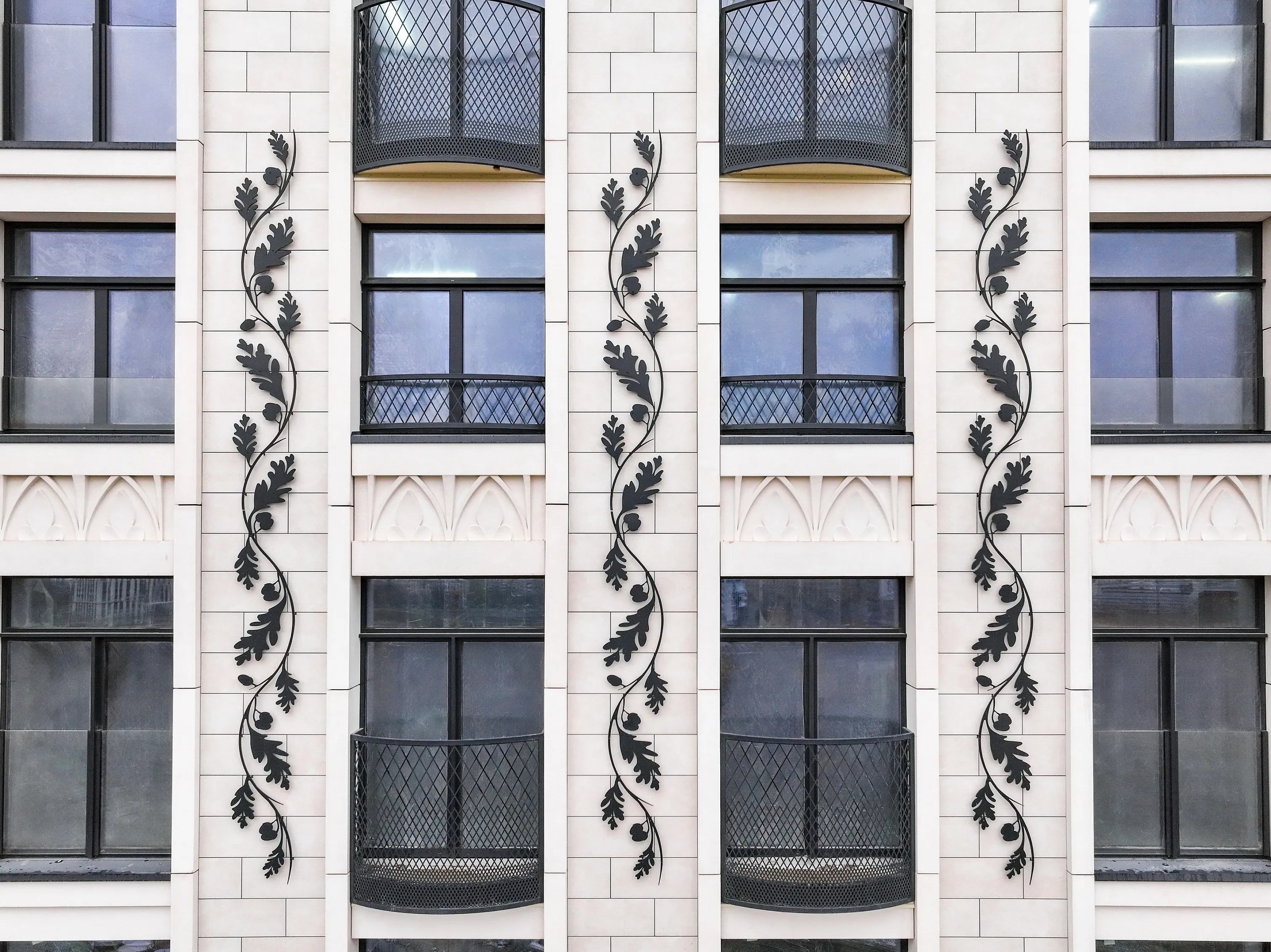 Изящные декоративные детали из стеклофибробетона, стеклокомпозита и металла изготовлены на заказ. Фасады украшают 150 элементов из эмалированного стекла с орнаментом в виде пик и 71 дубовая ветвь. Последняя отсылает к улице Дубовая Роща, со стороны которой Sminex обустраивает пешеходный бульвар с фонтаном, кафе и магазинами на первом этаже дома. Рядом находится одноимённый парк, где совсем скоро жители будут гулять в окружении двухсотлетних дубов.